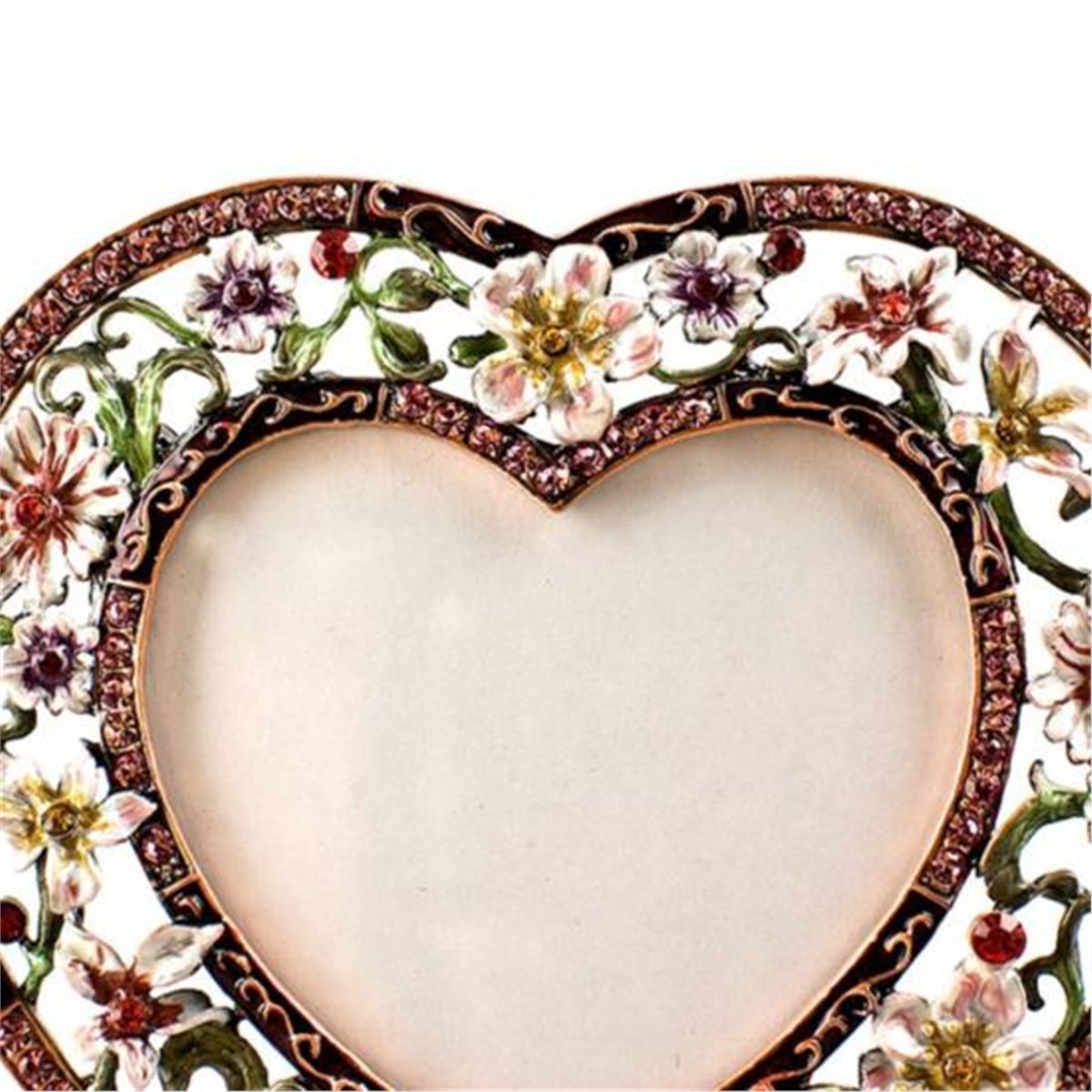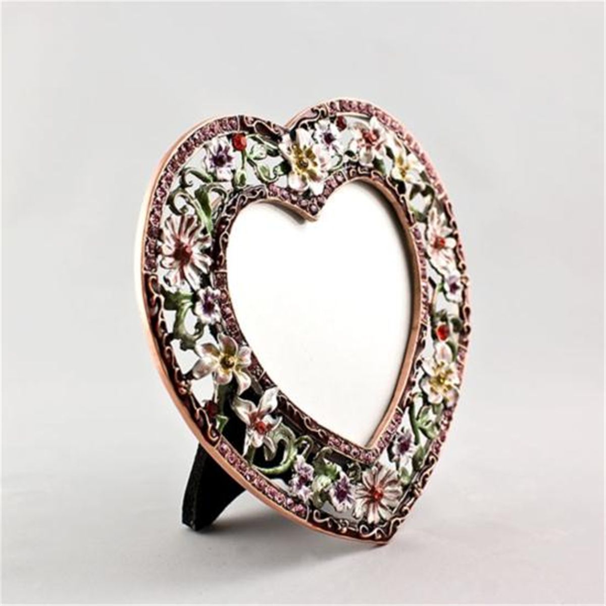 Maroon Heart Faberge Frame, The Faberge Maroon Heart Photo frame is ornamented by beautiful varied color enameled flowers. The edges are covered with pink/red crystals and beautiful ornaments. The colors and the designs are graceful and stylish to fit the elegance of the frame. Dimensions: 4in (H) X 4.5in (W), Material: Pewter, Crystals, Enamel.
