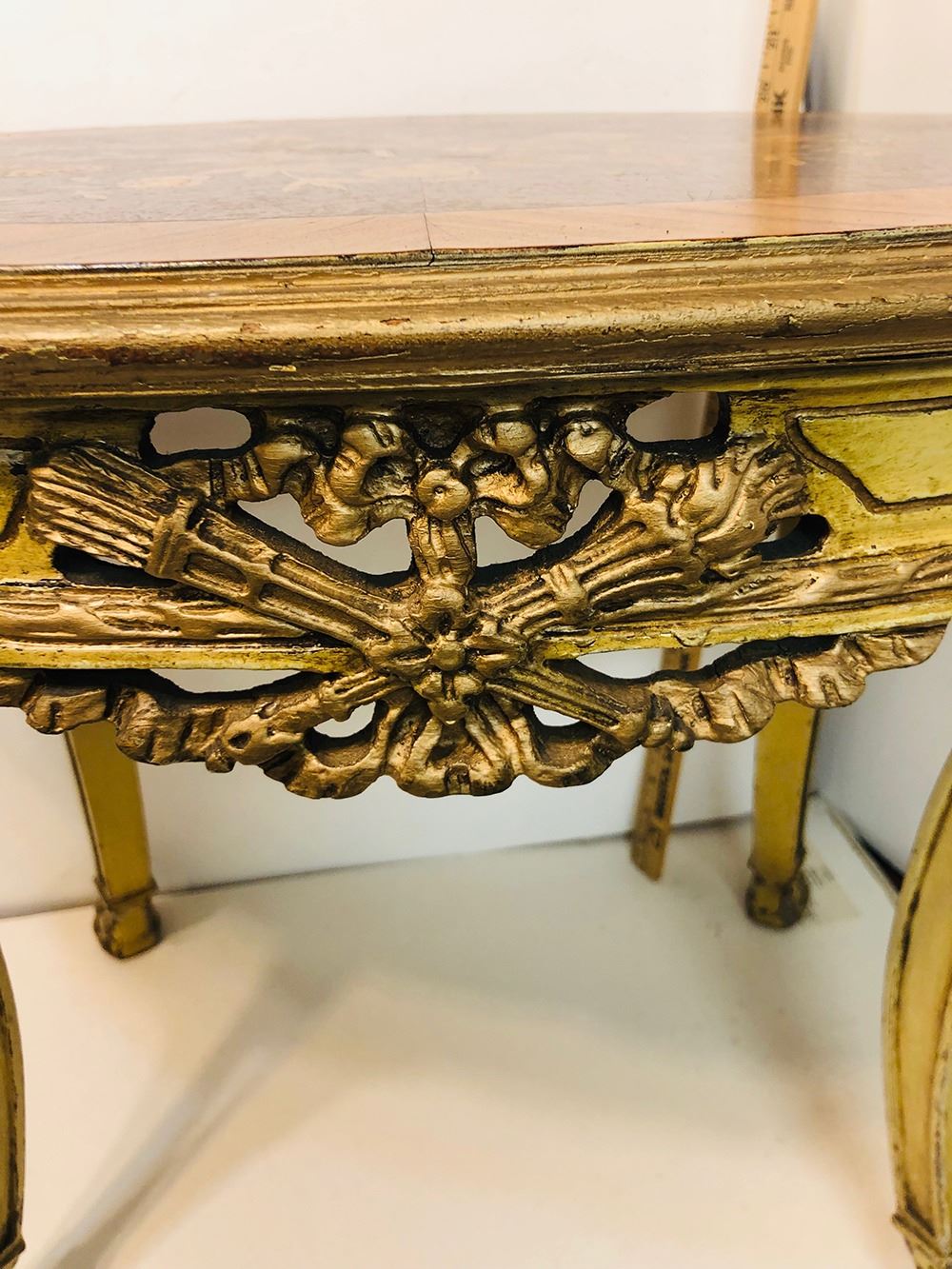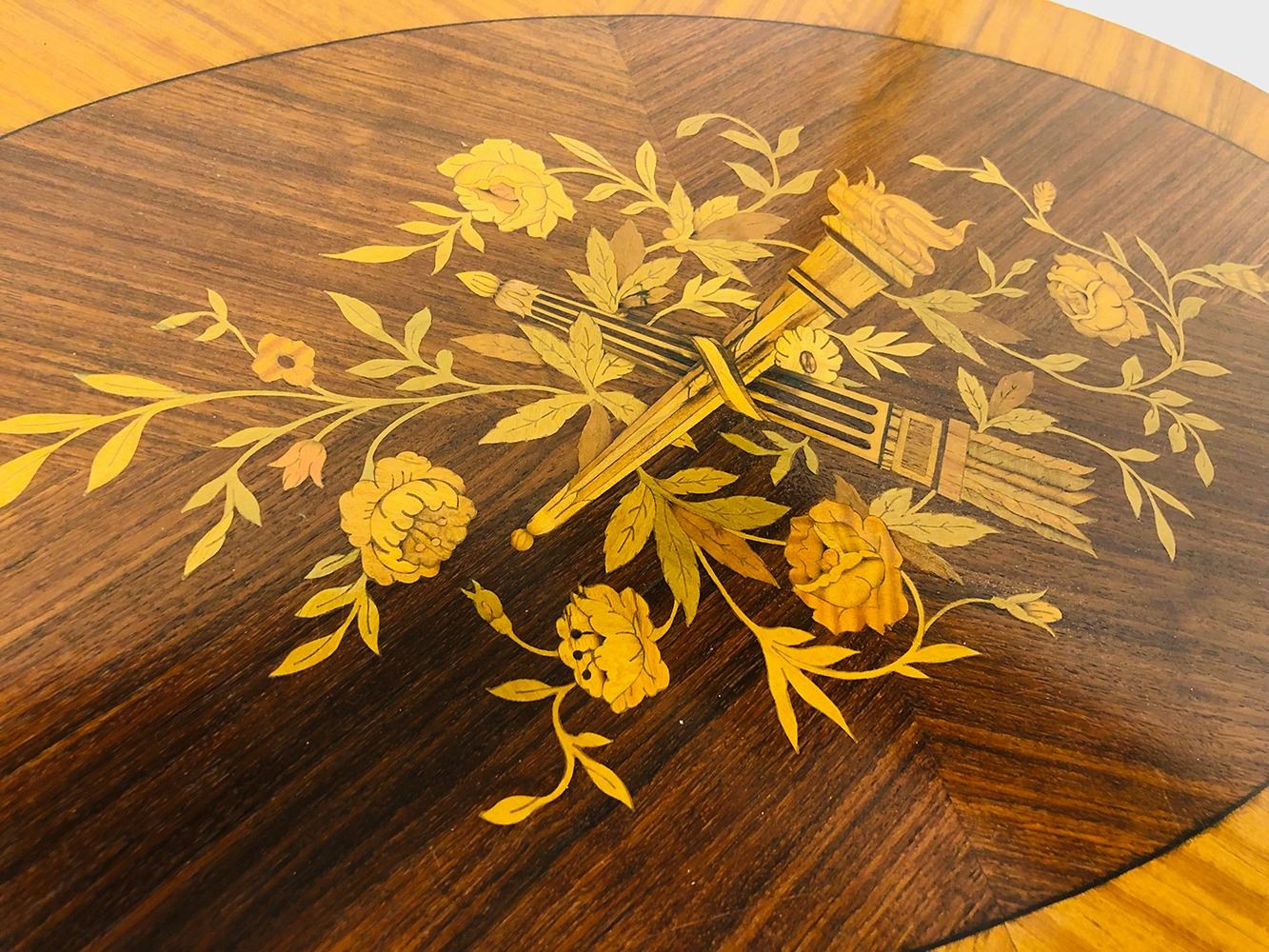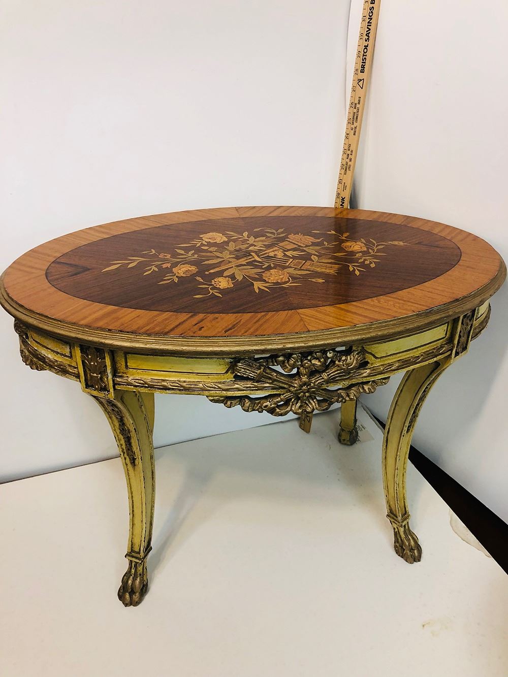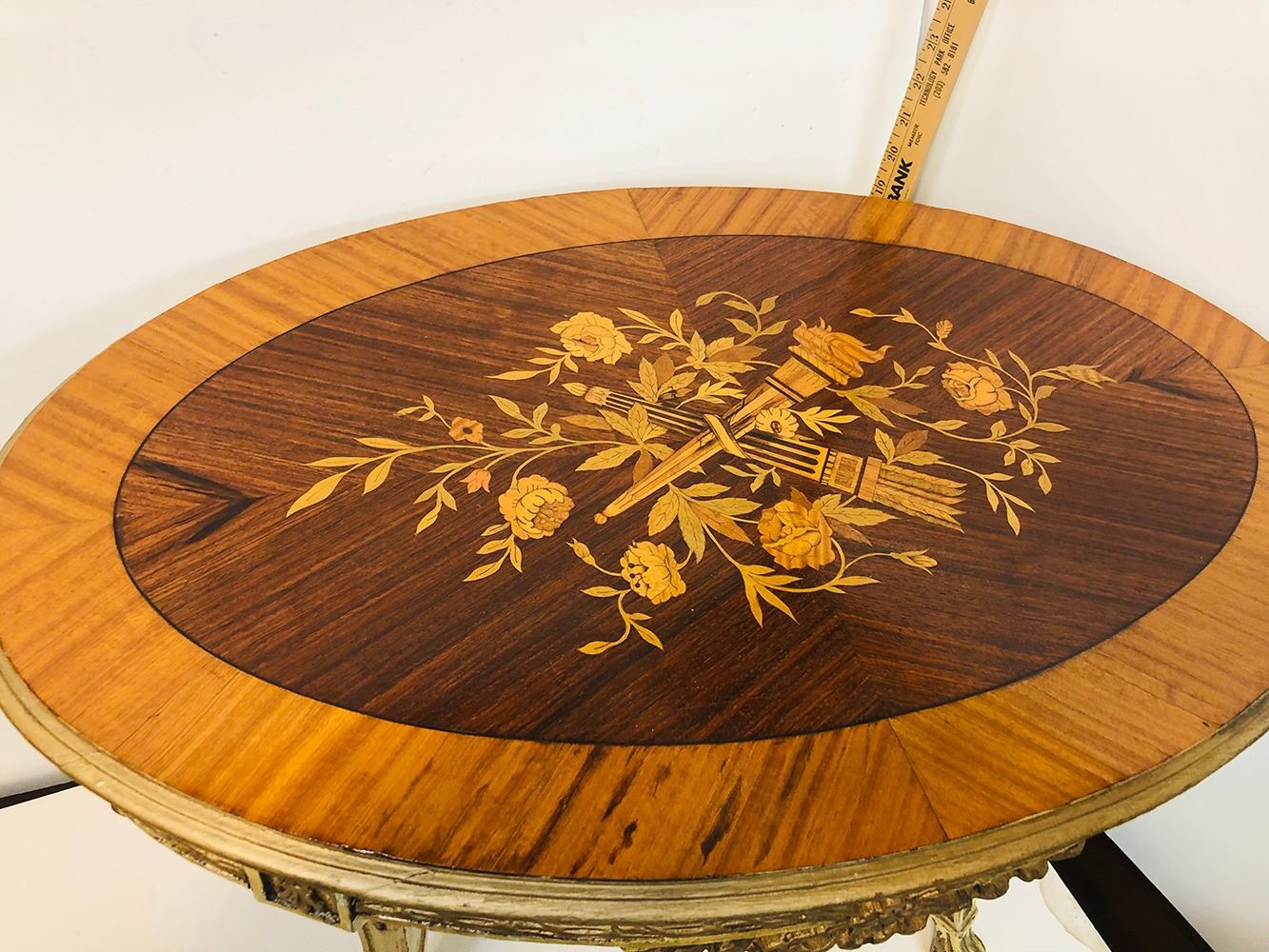 Fabulous marquetry inlay top with classical musical instruments. Base has carved panels all the way around, on beautiful claw feet, paint decorated base, very unusual style, coffee table size. Measures approx. 28" long x 18" wide x 20" tall.