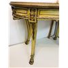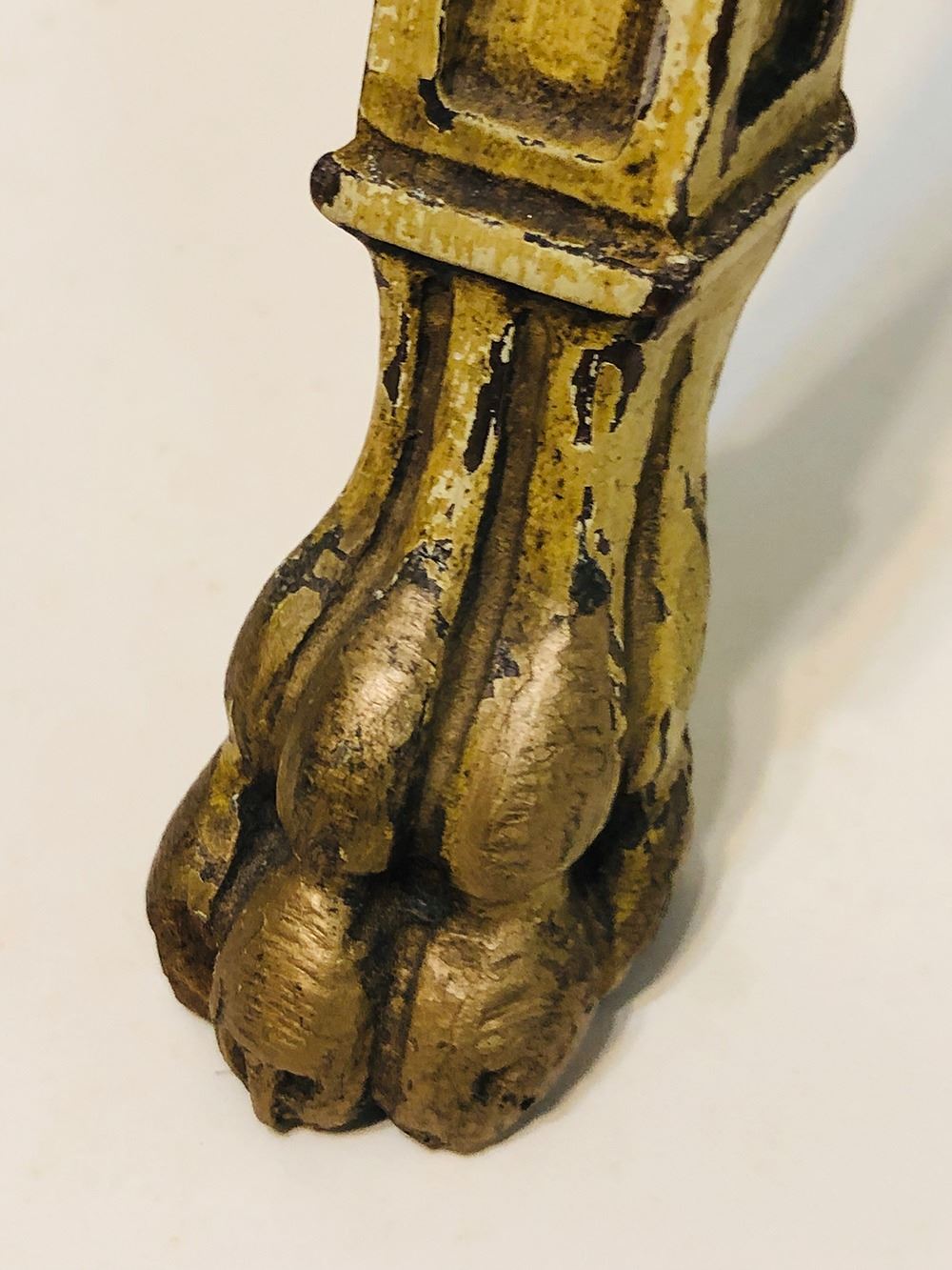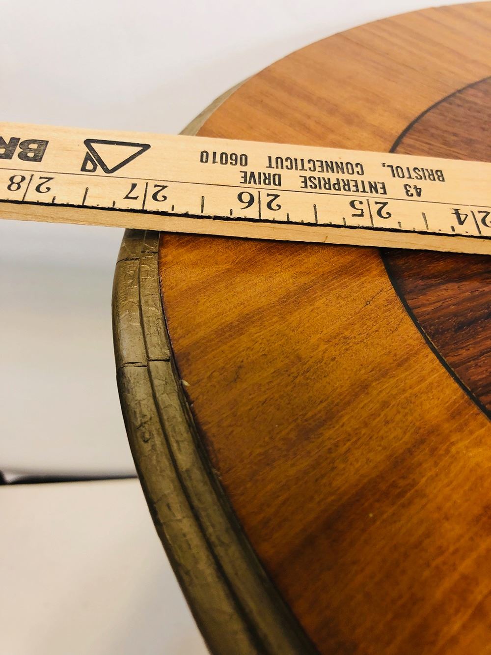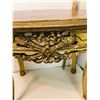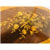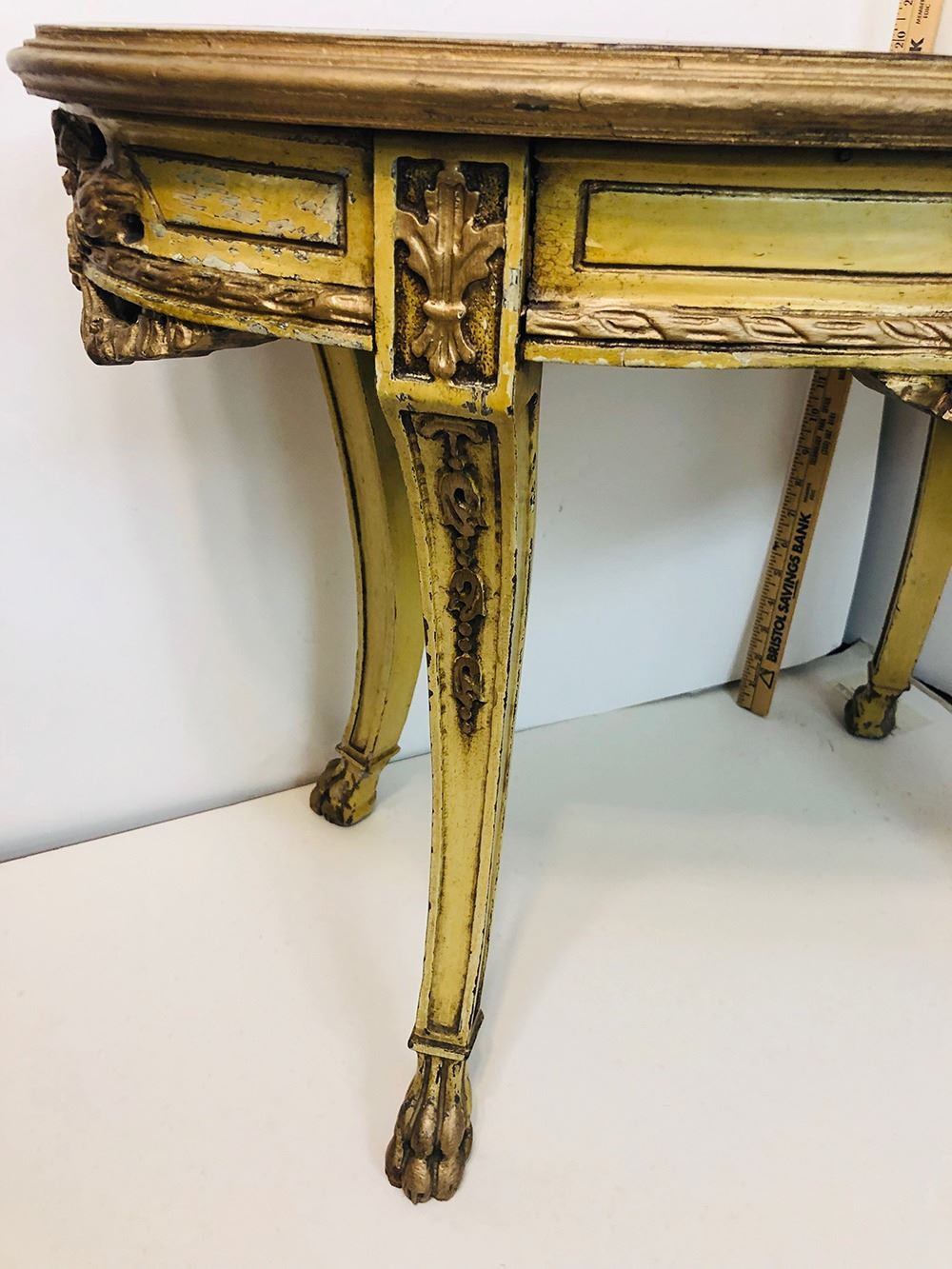 Fabulous marquetry inlay top with classical musical instruments. Base has carved panels all the way around, on beautiful claw feet, paint decorated base, very unusual style, coffee table size. Measures approx. 28" long x 18" wide x 20" tall.