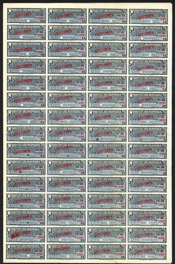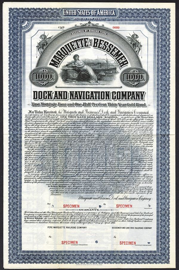 Michigan, incorporated in New Jersey. $1000 Gold Coupon Bond Specimen. ABNC Boston, Litho. POCs. Very Fine.