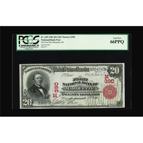 <B>Marquette, MI</B></I> - $20 1902 Red Seal Fr. 639 <B>The First NB</B></I> Ch. # (M)390<BR>An absolutely stunning <B>PCGS Gem New 66PPQ.</B></I> There are only about 120 Red Seals known in total for the entire state of Michigan and this is the only issuer that the foresight of a previous generation has preserved any quantity in the higher grades for the enjoyment of today's collectors. We are unable under the closest scrutiny to discover a hint or suggestion of even the most petty or petulant reason to quibble with the assigned premium grade. Quite simply, this is just an unusually appealing Red Seal enhanced even more by the imposing presence of the President's overwhelmingly large vanity signature. The is one of the nicest of this type and denomination one could ever hope to find and will certainly enhance the collection of the fortunate new owner.