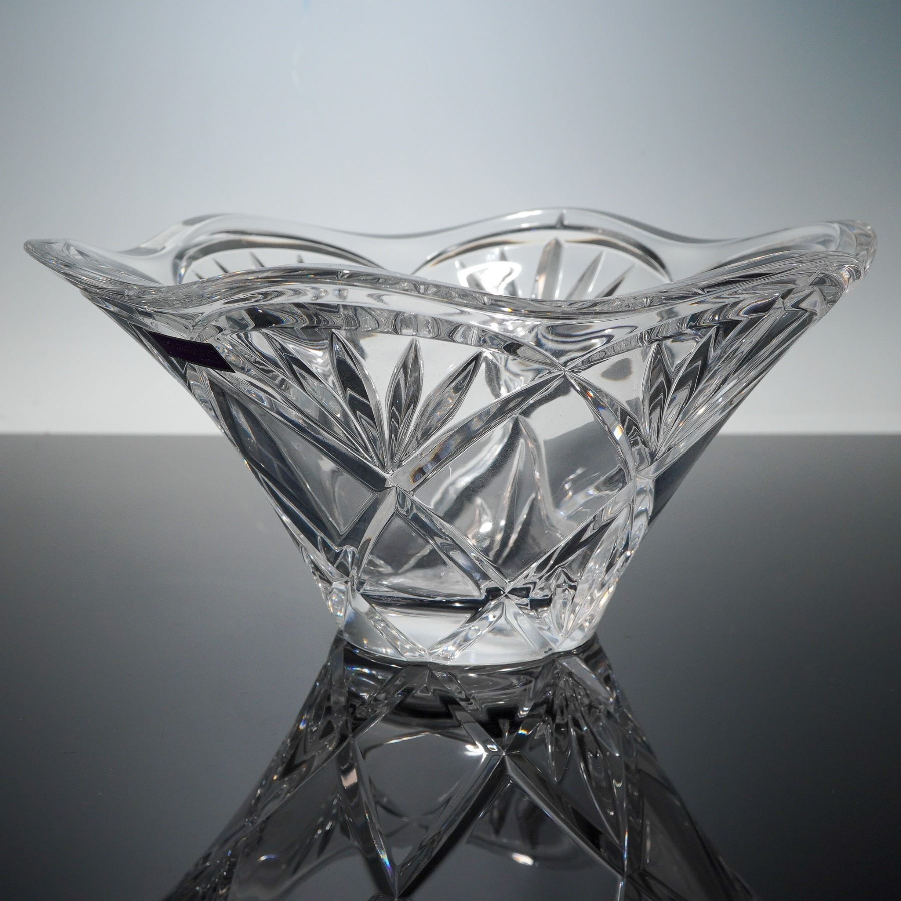 Exceptional clear crystal bowl in the Honour pattern, featuring a gracefully curved rim and elegant crisscross and fan cut design that embodies the timeless sophistication of the brand. The bowl's sculptural form and brilliant clarity make it a refined accent piece. Marquis by Waterford sticker label. Marquis by Waterford backstamp. This item has its original box. Box measures: 8"L x 8.75"W x 4.25"H.