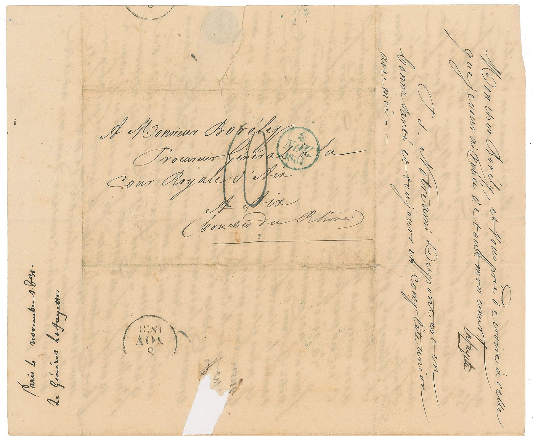 In an undated letter, likely from the reign of Charles X, Lafayette writes (translated): “The comments which you made about the pessimistic system of our opponents, about the tactic, adopted early, of persistently strengthening a disgust for liberty by anarchy and of inciting, at great risk, excesses and crimes in order to attribute them to liberal ideas—these comments…are enlarged and confirmed every day.” When the chamber of 1830 opposed King Charles X, he dissolved it, only to find the succeeding chamber even more uncompromising. His response—the suspension of the constitution—led to the July Revolution, resulting in his abdication and exile.