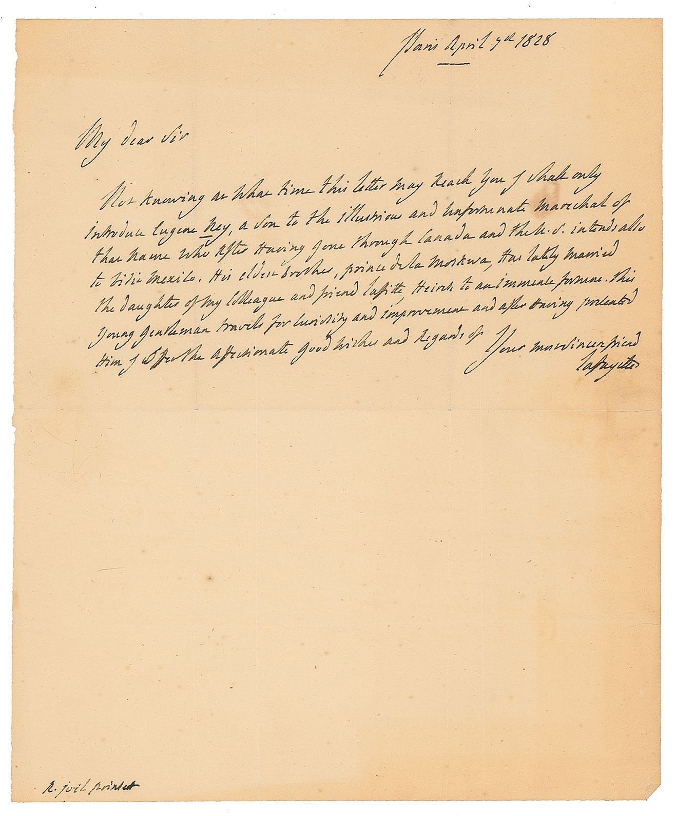 ALS signed “Lafayette,” one page, 7.25 x 8.75, April 7, 1828. Letter to a gentleman, in part: "Not knowing at what time this letter may reach you I shall only introduce Eugene Ney, a son to the illustrious and unfortunate Marechal of that name who after having gone through Canada and the U. S. intends also to visit Mexico. His elder brother, prince de la Moskowa, has lately married the daughter of my colleague and friend Lafitte…This young gentleman travels for curiosity and improvement." In fine condition, with light toning and creasing.