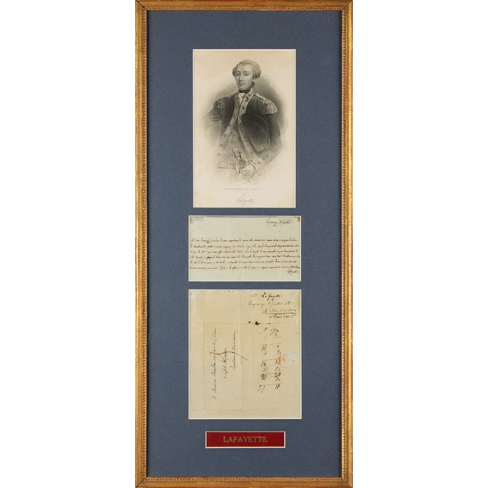 ALS in French, signed “Lafayette,” one page, 5.5 x 3.25, July 5, 1811. A handwritten letter addressed from “La grange,” in part (translated): “I beg your pardon for importuning you, my dear Sir, but they wrote me that the wool from Rambouilles (legs and sides included) has been sold 49 Sols. This is a big increase over the price of 35s, which was offered before that sale. Kindly let me know what you think of this increase, and at what rate you advise me to accept proposition. The shearing of this year will be…but just as fine. I regret very much that you have not persisted in the plan on which Mr. Grand seemed to have wanted to do business at this time.” Includes the original mailing envelope hand-addressed by the Marquis de Lafayette. Both are matted and framed with an engraved portrait (bearing a facsimile autograph) to an overall size of 11 x 24.75. In very good to fine condition, with old tape stains to the top corners.