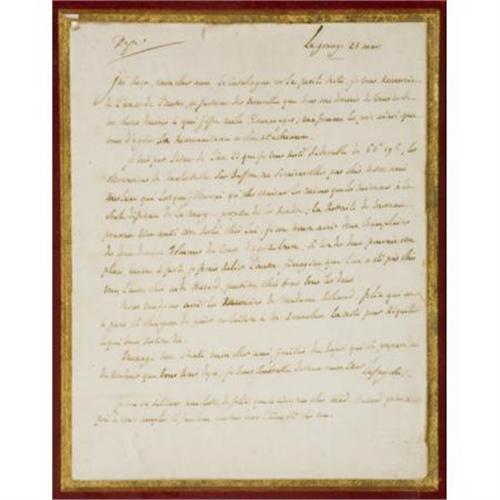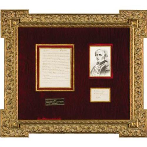 <B>Marquis de Lafayette Autograph Letter Signed</B></I>. One page, 6.5” x 8”, in French, Lagrange, March 23 (no year included). Sent to a “<I>Monsieur de Pougins</B></I>” in Paris, this letter was written after Lafayette’s return to France following his participation in the American Revolution (1777-79 and 1781). In 1787, Lafayette again would become involved in revolutionary activities, this time in his native country. The letter has been elaborately matted with a 4” x 6.5” etching of Lafayette and the cut address, 3.75” x 2.5”, of the recipient, and framed to a size of 31” x 27”. The letter is in good condition with minor tearing along the right margin.<BR><BR><b>Shipping:</b> Framed - with Glass, Large (<a target="_blank" href="http://www.heritageauctions.com/common/shipping.php">view shipping information</a>)