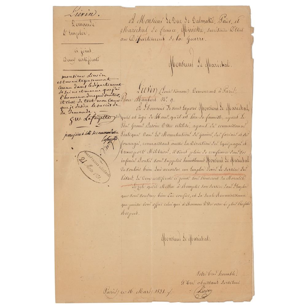 Manuscript DS in French, signed “Lafayette,” one page, 8.5 x 12.5, March 1831. Untranslated document endorsed in the left margin by Gilbert du Motier, Marquis de Lafayette, below an endorsement by his son, Georges Washington de La Fayette. In fine condition.