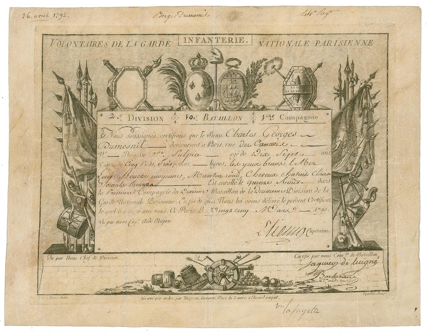 French statesman and military officer (1757–1834) who became an intimate associate of George Washington and who advanced the American cause on both sides of the Atlantic. Though he espoused many of the principles behind the French Revolution while advocating a limited monarchy, extremist elements in the French Assembly declared him a traitor, whereupon he was jailed for five years. In 1824–1825 he revisited America, where he was hailed as a hero and granted a generous stipend and parcel of land. Partly-printed vellum DS, in French, signed “Lafayette,” one page, 11.75 x 9.25, March 25, 1790. Document reads, in part (translated): “Volunteers of The National Guard of Paris, 2nd Division, 10th Battalion, 1st Company. We have signed below and certify that Mr. Charles Georges Dumesnil…is engaged on the 15th August in the 1st Company of the 10th Battalion of the Second Division of the National Guard of Paris.” Signed in the lower border by Lafayette, and countersigned by several other officers. Several vertical folds, scattered creasing and wrinkling, and mild soiling, otherwise very good condition. This certificate was granted not only during a period of reorganization within the French armed forces, but within the nation itself. Lafayette is uncommon in this format.