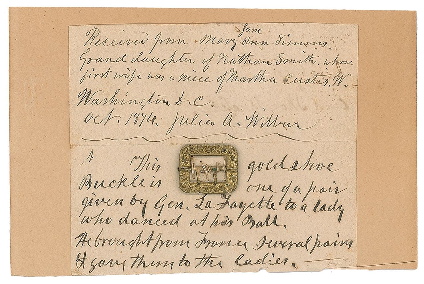 Brilliant golden shoe buckle presented as a gift by Gilbert du Motier, Marquis de Lafayette. The ornate gold-tone buckle measures .75 x .75 and bears a detailed raised floral pattern and two closures on the swivel backing. The buckle is mounted to an off-white 4 x 3.75 period sheet relaying its provenance, in full: “Received from Mary Jane Ann Simms, Grand daughter of Nathan Smith, whose first wife was a niece of Martha Custis W.—Washington D.C., Oct. 1874. Julia A Wilbur.” An additional docket beneath the buckle reads, in full: “This gold shoe Buckle is one of a pair given by Gen. LaFayette to a lady who danced at his Ball. He brought from France several pairs & gave them to the ladies.” The sheet is affixed to a slightly larger card. In fine condition.
