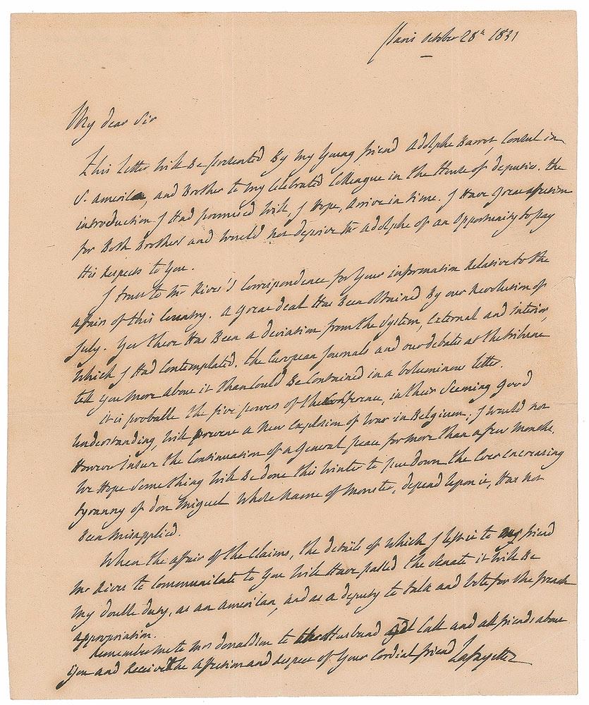 ALS signed “Lafayette,” one page, 7.25 x 8.75, October 28, 1831. A significant letter concerning the fluid political events in Europe, in part: "A great deal has been obtained by our Revolution of July. Yes, there has been a deviation from the system, external and interior, which I had contemplated. The European Journals and our debates at the Tribune tell more about it than could be contained in a voluminous letter. It is probable that the five powers of the Conference, in their seeming good understanding, will prevent a new explosion of war in Belgium. I would not however insure the continuation of a general peace for more than a few months. We hope something will be done this winter to put down the ever increasing tyranny of don Miguel whose name of Monster, depend on it, has not been misapplied. When the affair of the claims, the details of which I left to my friend Mr. Rives to communicate to you, will have passed the Senate it will be my double duty, as an American, and as a deputy to talk and vote for the French appropriation." In fine condition, with scattered light creasing and several intersecting folds.