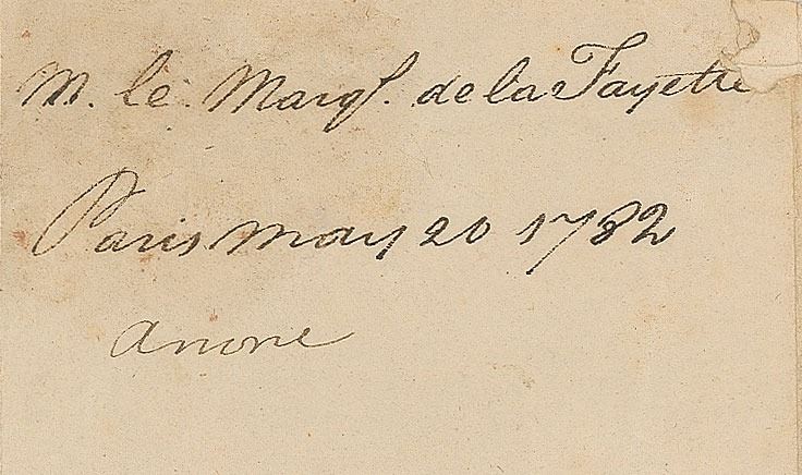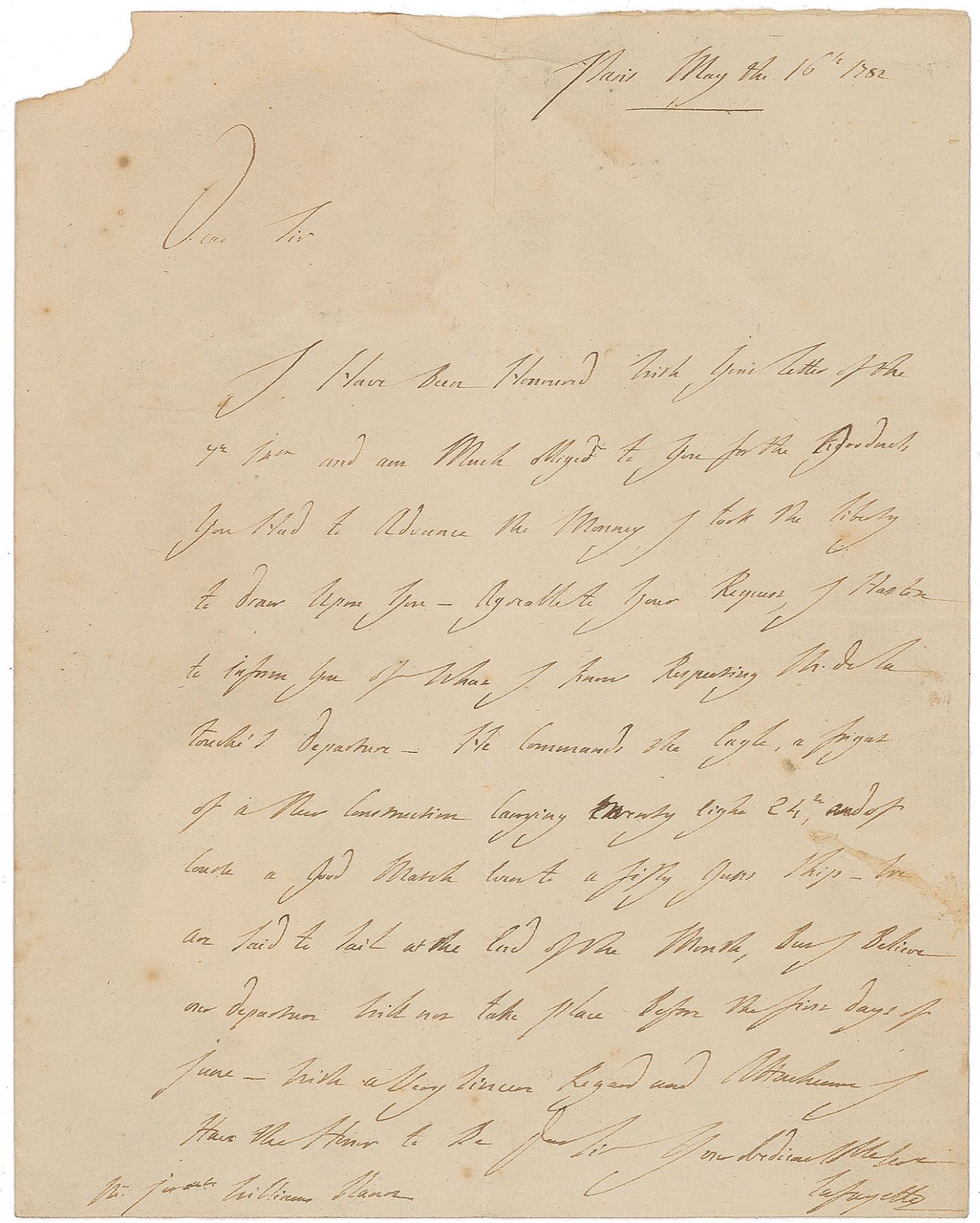 Revolutionary War–dated ALS in English, signed “Lafayette,” one page, 6.75 x 8.5, May 10, 1782. Letter referencing Captain Louis-Rene Levassor de Latouche Treville and his frigate Aigle, in part: "I have been Honoured with your letter of the 7th…and am much obliged to you for the Goodness you had to advance the money I took the liberty to draw upon you. Agreeable to your request I hasten to inform you of what I know respecting Cte. de la Touche's departure—He commands the Eagle, a frigate of a new construction…and of course a good match even to a fifty gun ship. We are said to sail at the end of the Month, but I believe our departure will not take place before the first days of June." In very good to fine condition, with overall creasing, and paper loss to the upper left corner. Captain Latouche assumed command of the Aigle in early 1782, and in September was captured by the British when it ran aground. The Aigle remained in the service of the British Royal Navy until being wrecked in 1798.