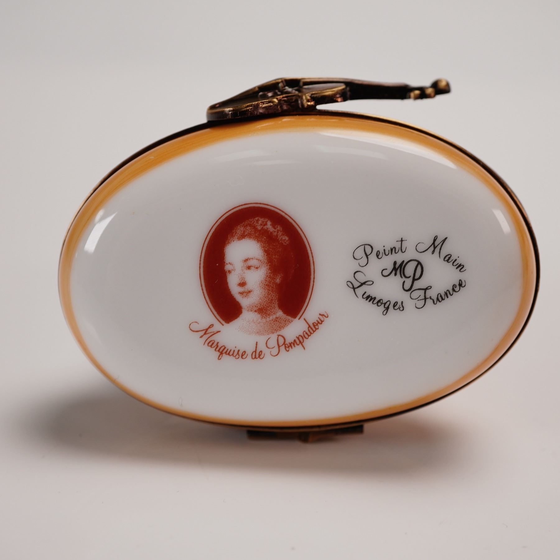 This charming trinket box from the Marquise de Pompadour Limoges collection features an elegantly crafted porcelain cat seated atop an oval box, holding a violin that doubles as the lid clasp. Upon opening, the interior reveals a delicately painted musical note, adding a delightful narrative touch. Created by skilled Limoges artisans using hand-painted fine white paste, each piece undergoes multiple firings, glazing, and is finished with an antique brass hinge - methods rooted in centuries-old French tradition. Adorned with a Marquise de Pompadour backstamp and expertly hand-sculpted and painted details, this box exemplifies the artistry and whimsical charm synonymous with the Marquise de Pompadour Limoges line.