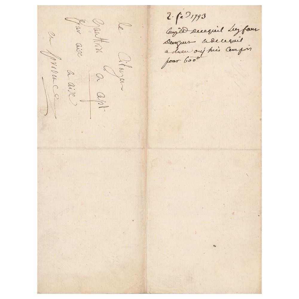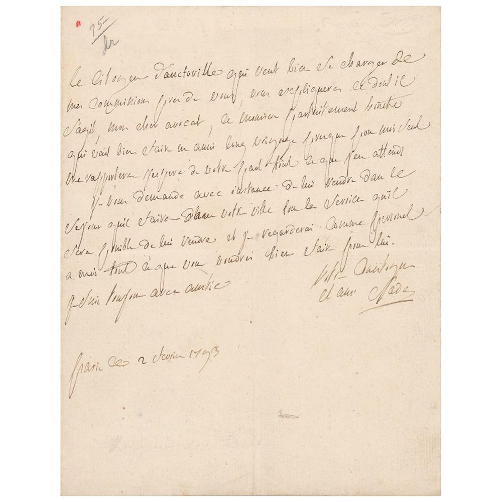 ALS in French, signed ‰ÛÏSade,‰Û one page, 6 x 8, February 2, 1793. Handwritten letter to Citizen Gauthier, in full (translated): "Citizen d'Anetoville who is good enough to undertake my business with you will explain to you, my dear lawyer, what it is all about. This very upright gentleman who is good enough to make such a long trip practically just for me will, I hope, bring back from you all that I expect. I urgently request that during his stay in your city you render him every assistance within your power, and I shall consider everything which you are good enough to do for him as a personal favor to myself." Addressed on the reverse in de Sade's hand. In fine condition.