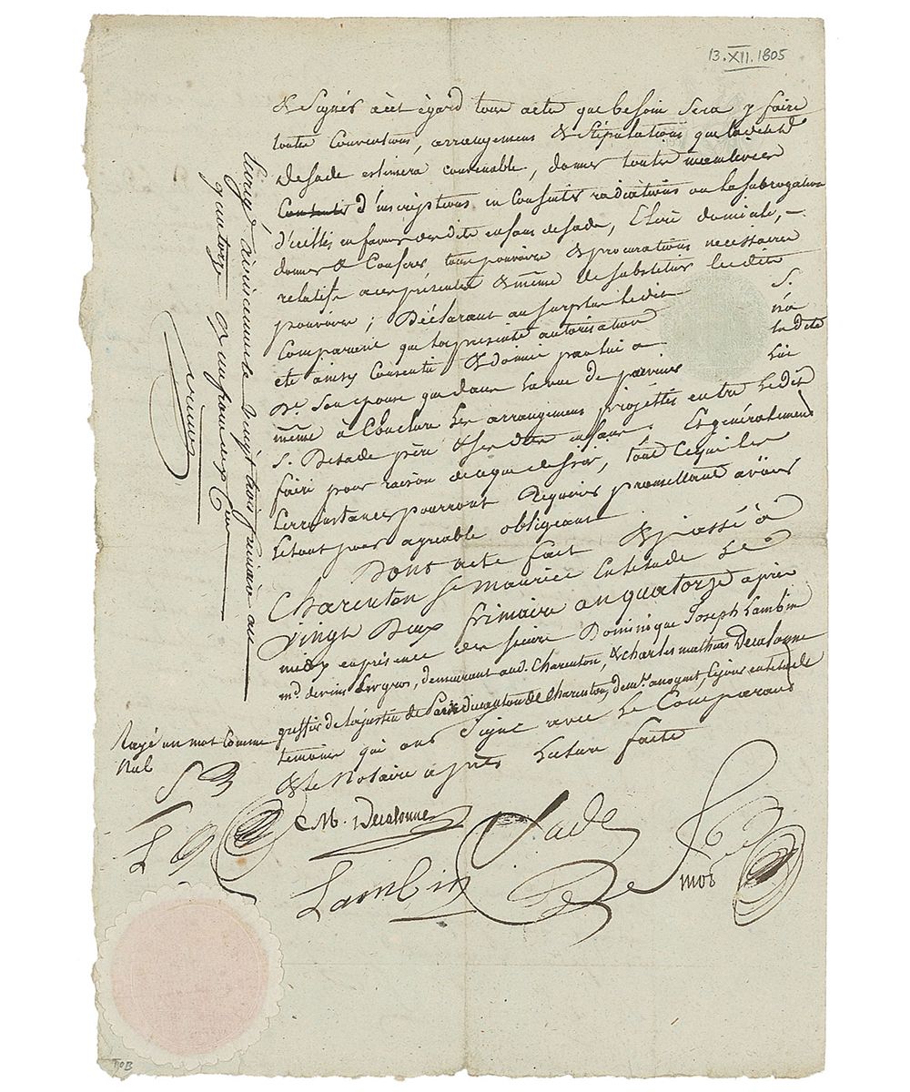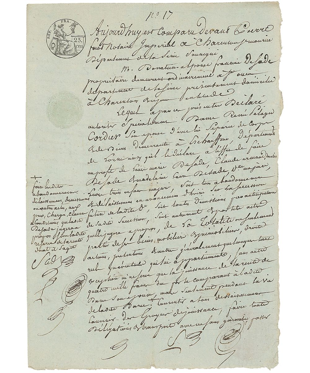 Notorious French novelist and playwright (1740–1814) whose violent sexual escapades and depravity-infused works gave rise to the word ‘sadism.’ Manuscript DS in French, signed twice, “Sade,” one page both sides, 7 x 10, December 13, 1805, written while Sade was incarcerated in the mental asylum at Charenton. lt connects Lady Renée Pelagie Cordier, his wife, and Sade in a legal agreement making a concession "on the inheritance to be left by said lady to the benefit of Louis Marie de Sade, Claude Armand de Sade, and Madeleine Laure de Sade, recently of age…The totality or only part of the properties, rights, and other claims, both real or future, that belonged to her, without any exception or reservation other than the use of the four thousand francs annuity owed by Mr. de Sade to said lady, his wife." The document continues, asking Lady de Sade to "agree to all changes and abrogations pertaining to said documents to the benefit of said de Sade children." ln conclusion the document states that "Sade has appeared today to declare that this authorization was agreed to and given to said lady, his wife, with the sole aim to achieve for himself projected arrangements between said Lord de Sade Sr. and his children." Signed a total of four times, twice “Sade,” and twice “S.” Intersecting folds, a couple small notations, and a bit of trivial toning, otherwise fine condition. Although institutionalized, de Sade was highly concerned about the welfare of his children. De Sade’s wife was instrumental in encouraging her husband’s writings and presenting them in an acceptable manner to the public.