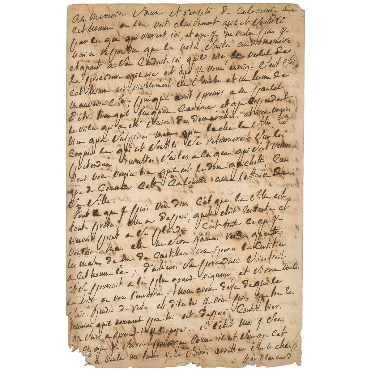 ALS in French, unsigned, four pages on two adjoining sheets, 8.25 x 12.75, no date but circa January 1777. Letter to Maitre Gaufridy. In full (translated): "The memo of this man is false and full of slander, where it is clear that it is carried out by the people who came here, whom I did not want to, I can only answer with the notes added to the given memo; and as for his conduct here, that he denies, the record of the proceedings that he denies and that I have sent you is authentic. This man is obviously a cheater and a man of bad faith, as he had promised Mr. Paulet to be quiet until Lent and yet, he has made some steps. And you see, even assuming that the girl will be released, that rascal will return on the alleged insults to those people who came, you see that he is the Don Quixote. Indeed what has in common the case of his daughter with this slander?