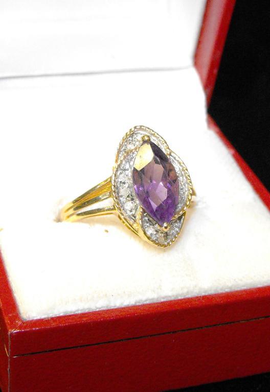 A14k YG ring with 3 ct. marquiae amethyst and pave diamonds.