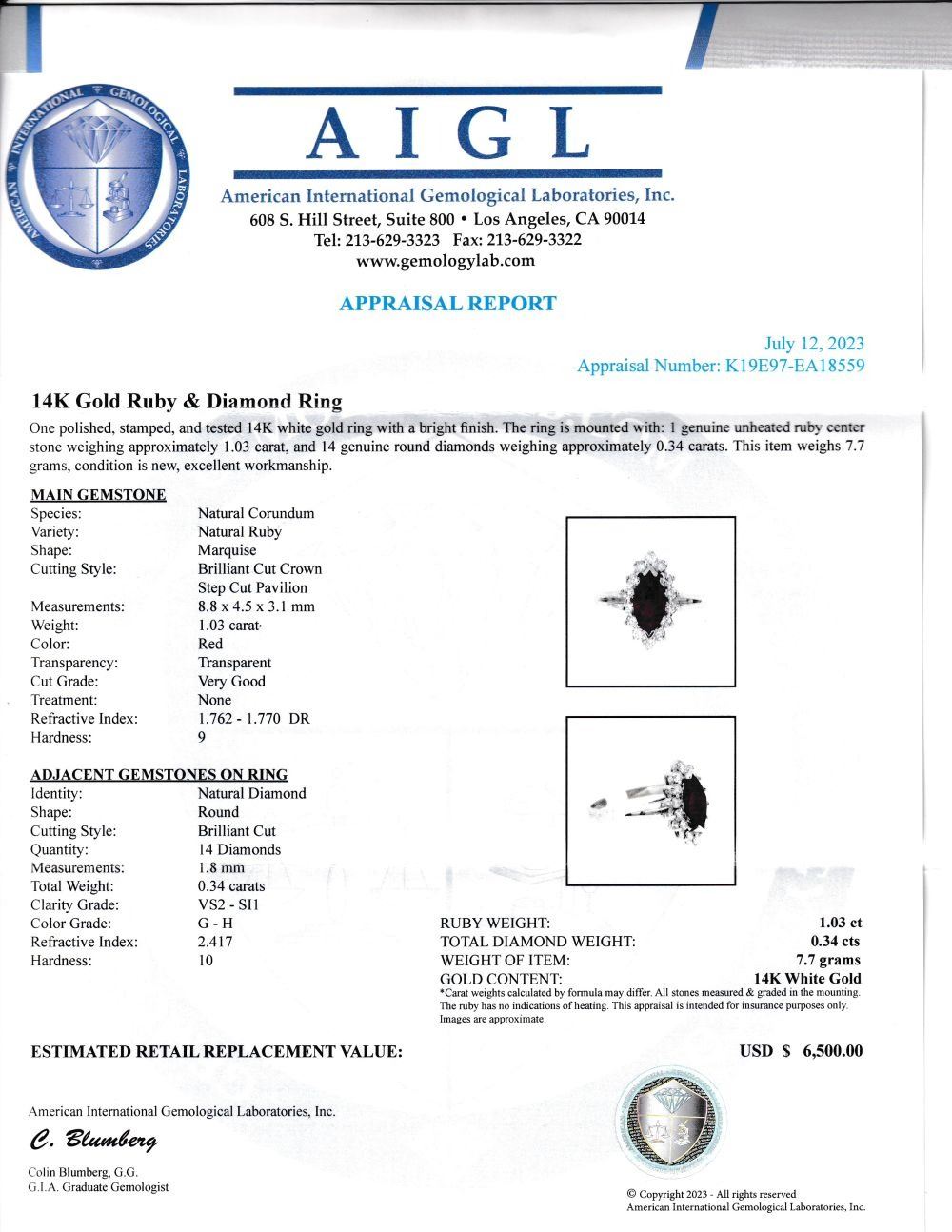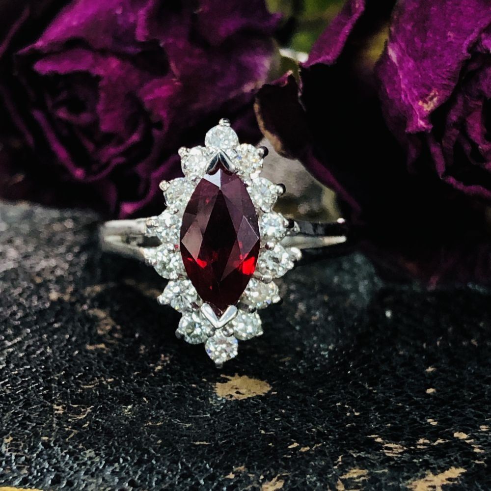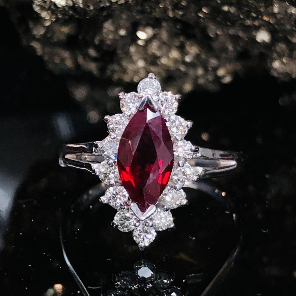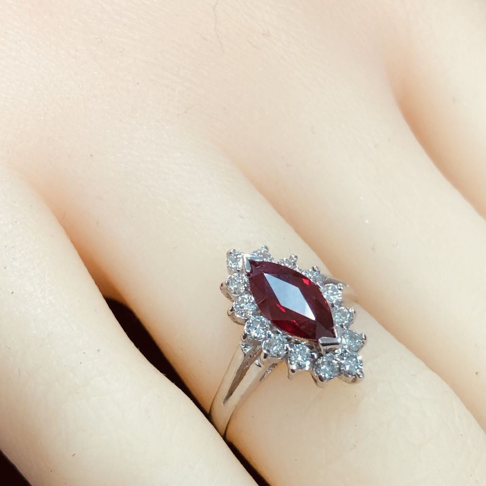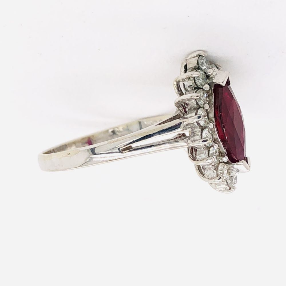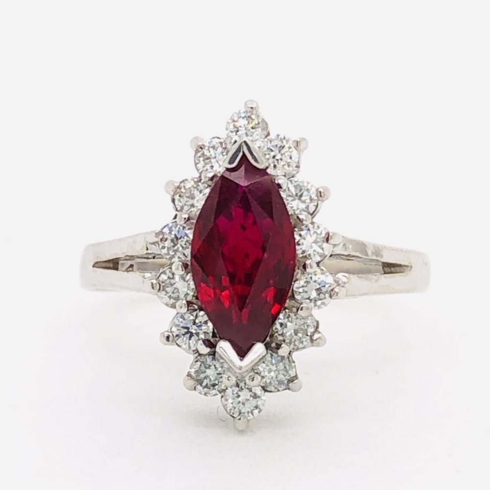 Genuine Ruby and Earth-Mined Diamond Ring.& nbsp; This 14 karat white gold ring features a 1.03 carat marquise-cut ruby that is V-prong set with .34 carats of round, brilliant-cut, G-H color, VS2-SI1 clarity diamonds in the halo. The ring spans approximately 5/8& quot; on the top of the finger.& nbsp; The ring is stamped on the inside shank with 14K& nbsp; USA SG (with a crown over the & quot;G& quot;).& nbsp; & nbsp;The ring is US size 5.25 and has a ribbed under gallery and slightly split shoulders.& nbsp; This ring can be resized for an additional $100, please allow an additional 10 days for shipping if we resize it.& nbsp; This ring is certified and appraised for $6,500.00 estimated retail replacement value.