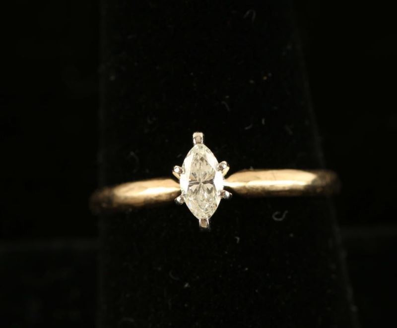 Sparkling marquise cut diamond set in 14K yellow gold. Size 8 1/2.