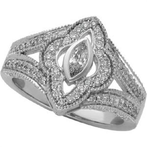 14k White Gold DIAMOND ENGAGMENT RING featuring a MARQUISE Cut Diamond surrounded by round Diamonds, with Diamonds set each side on the band. The Diamonds are all SPARKLING and in the 'SI' Clarity Category and Fine 'I' Color. The Diamond Total Weight = .75 CARATS! This beautiful Diamond Engagement Ring is a Size 7 and I can resize it for you either larger or smaller.