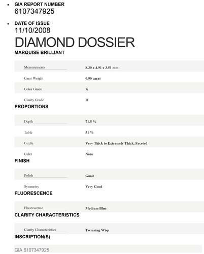 Marquise Diamond 0.9carat K:I1:GIA:Dim.:8.30*4.91*3.51