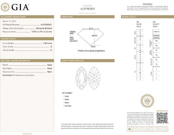 Marquise Diamond 1carat G:I2:GIA:Dim.:10.93*4.79*3.16