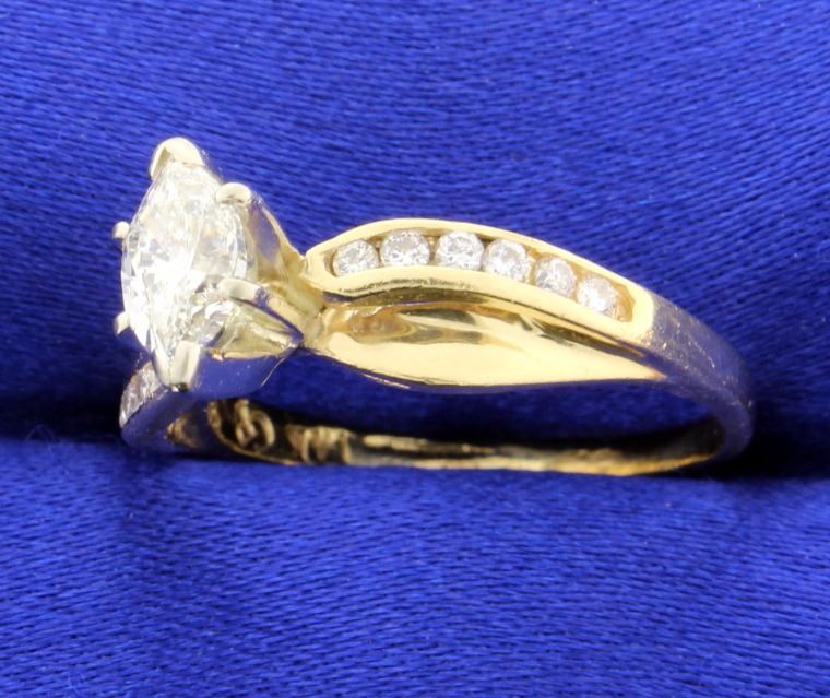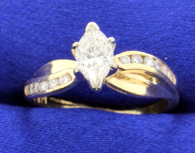 Lovely 1/2 carat diamond Marquise ring that measures 8.5mm x 4.51mm, SI1 clarity and I color. Set in the band is 12 full cut diamonds that weigh a total of 0.20 carats, SI clarity and H-I color. Size 7 3.3g