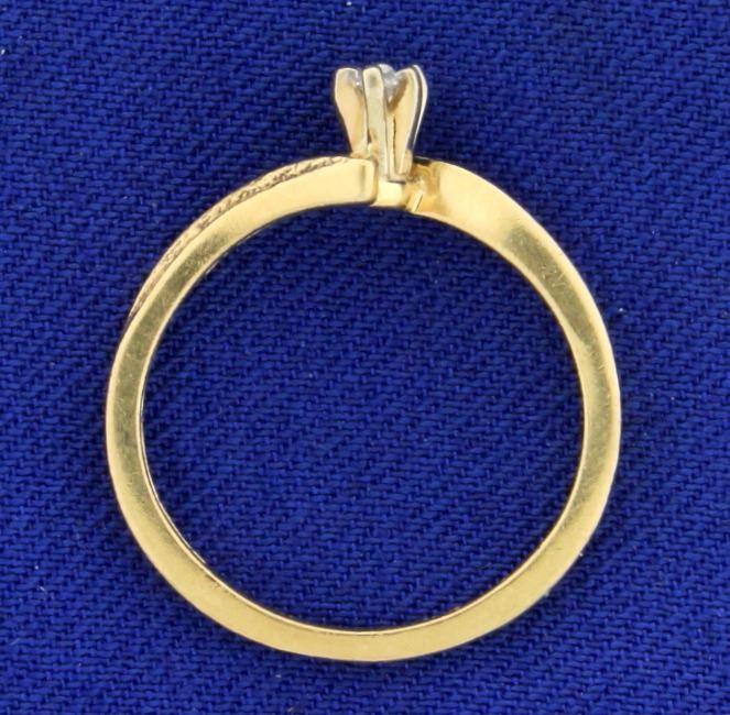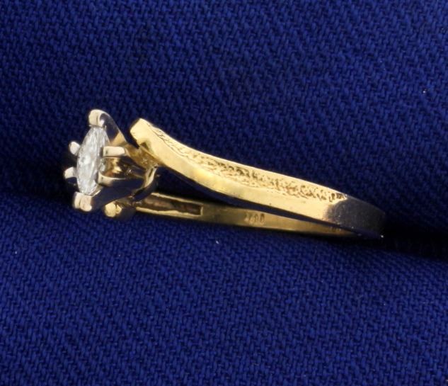 In 10k yellow gold. Contains a high quality .05ct marquise diamond, SI clarity/H color. Size 5. 1.6g.