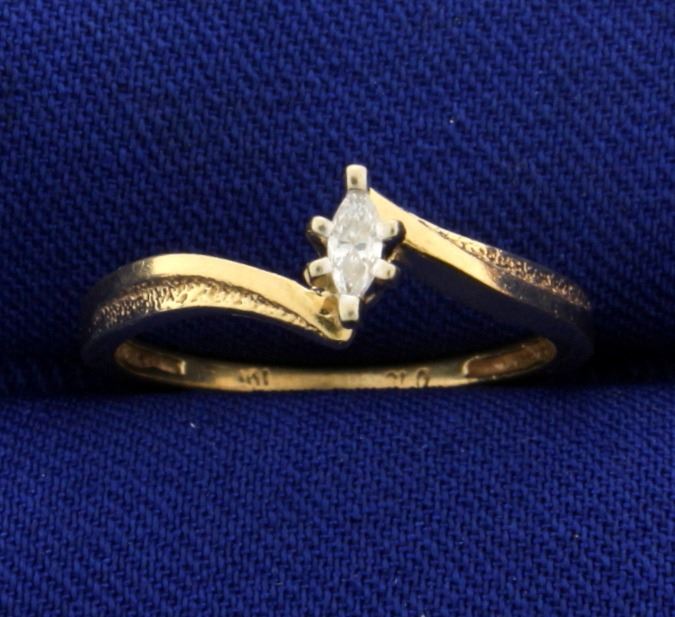 In 10k yellow gold. Contains a high quality .05ct marquise diamond, SI clarity/H color. Size 5. 1.6g.