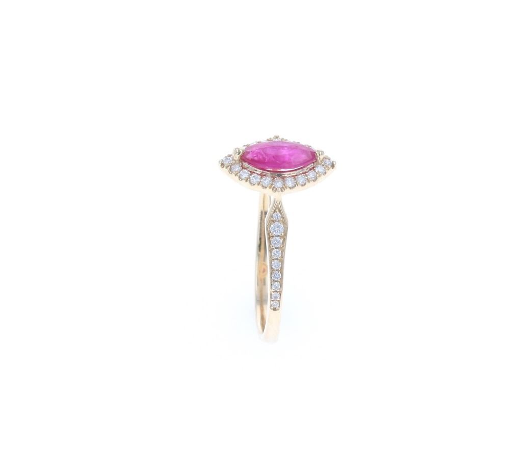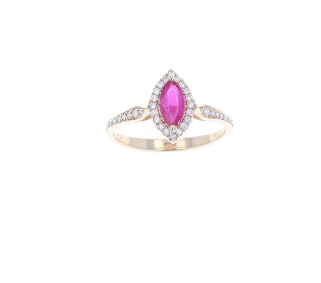 Featured in this lot is this marquise ruby and 14k yellow gold ring. The ring features a wonderfully and professionally crafted 14k yellow gold construction that shows a single marquise ruby that weights a total of 0.60 carats. The centerstone and pave set shoulders are decorated with a total of 38 round brilliant cut diamonds with a total weight of 0.17 carats. The condition of this ring is good with no obvious signs of damage and shows good overall condition. The measurements of this ring is 1" x 3/4". The ring size is US 7.