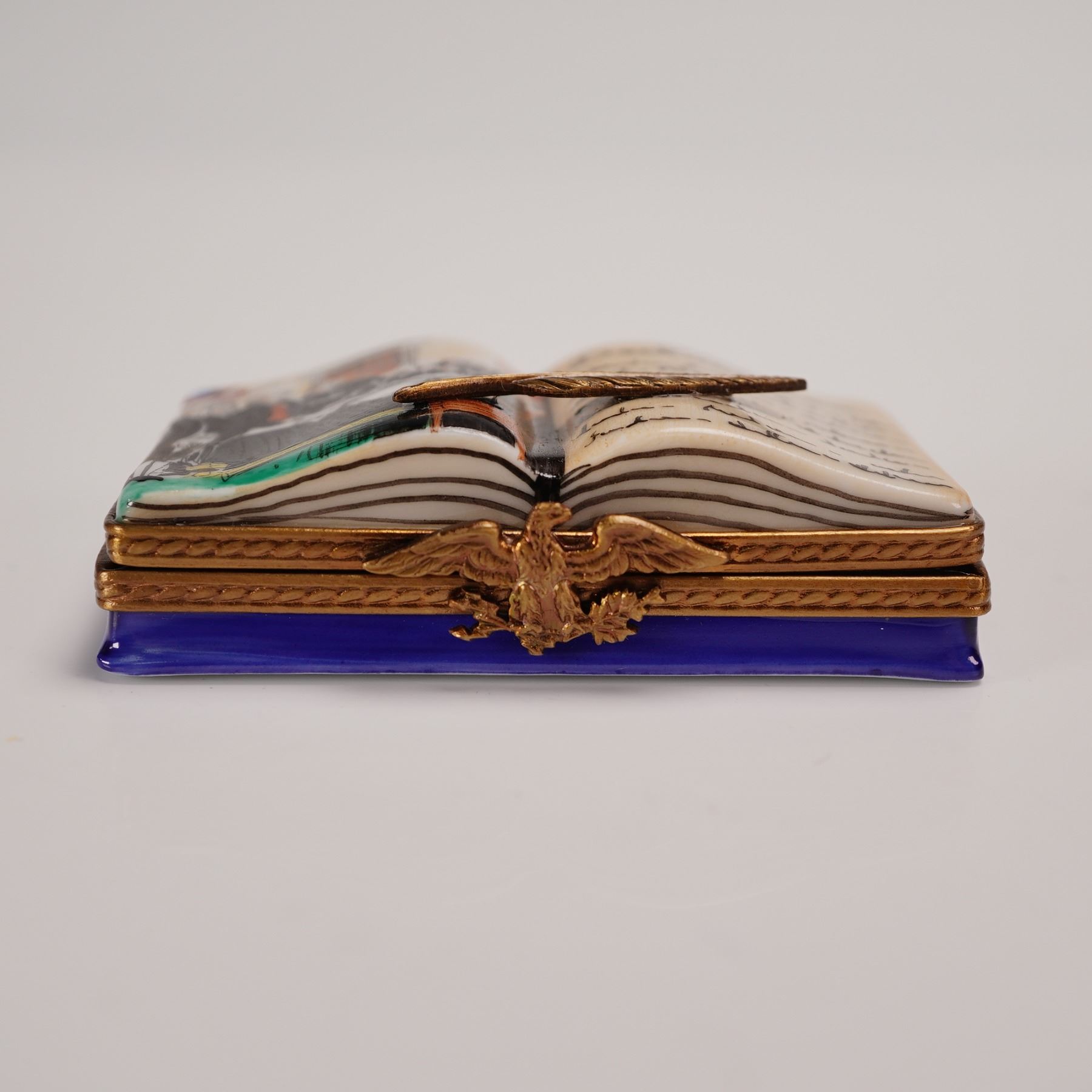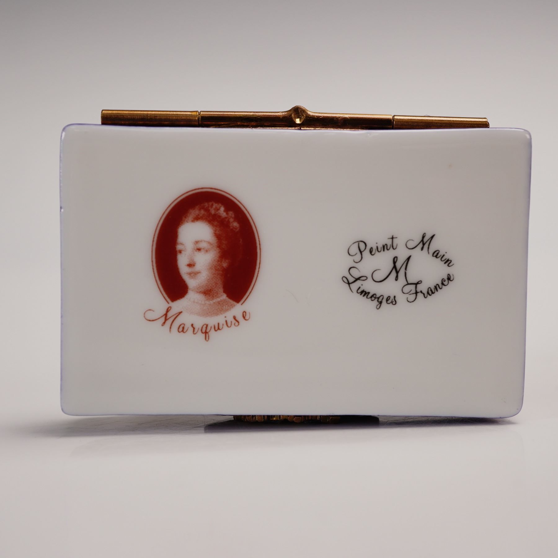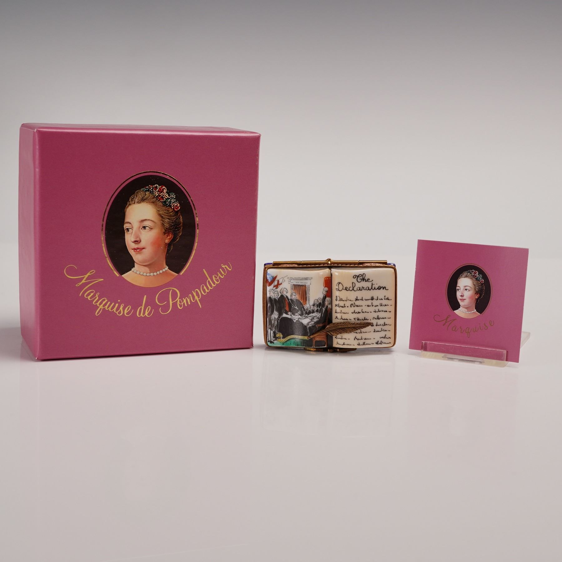 A limited edition hand-painted Limoges porcelain trinket box, modeled as Botticelli's "Birth of Venus," the standing figure with flowing hair emerging from a scallop shell atop a green base with ornate gilt clasp. The interior decorated with a star design. Reverse with portrait of the Marquise de Pompadour and marked Peint Main Limoges France MP. Complete with original fitted box and certificate.
