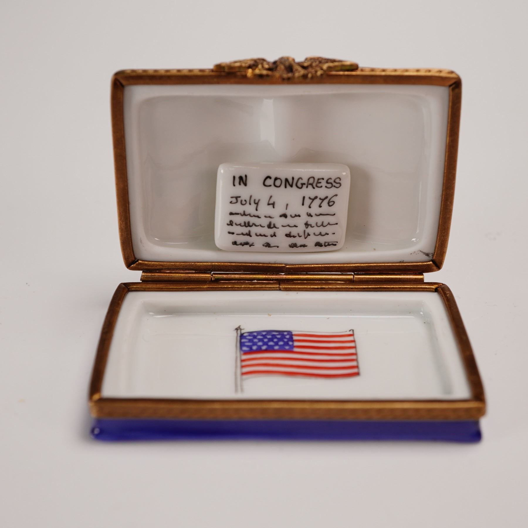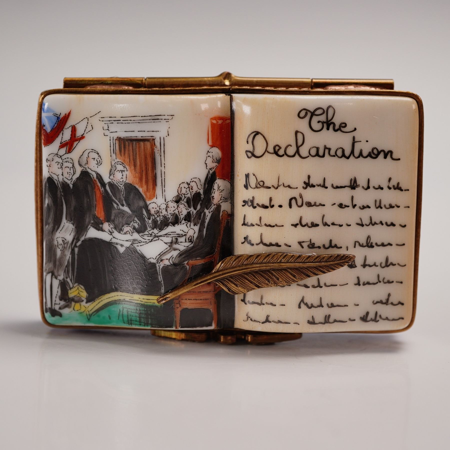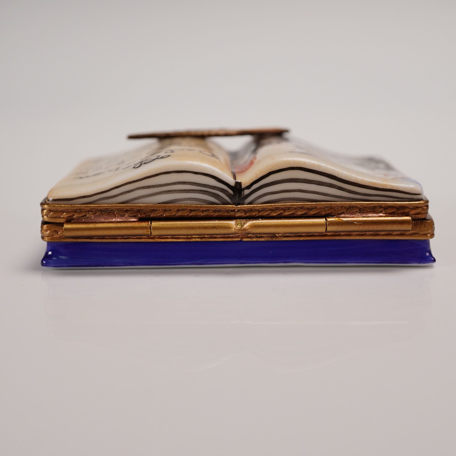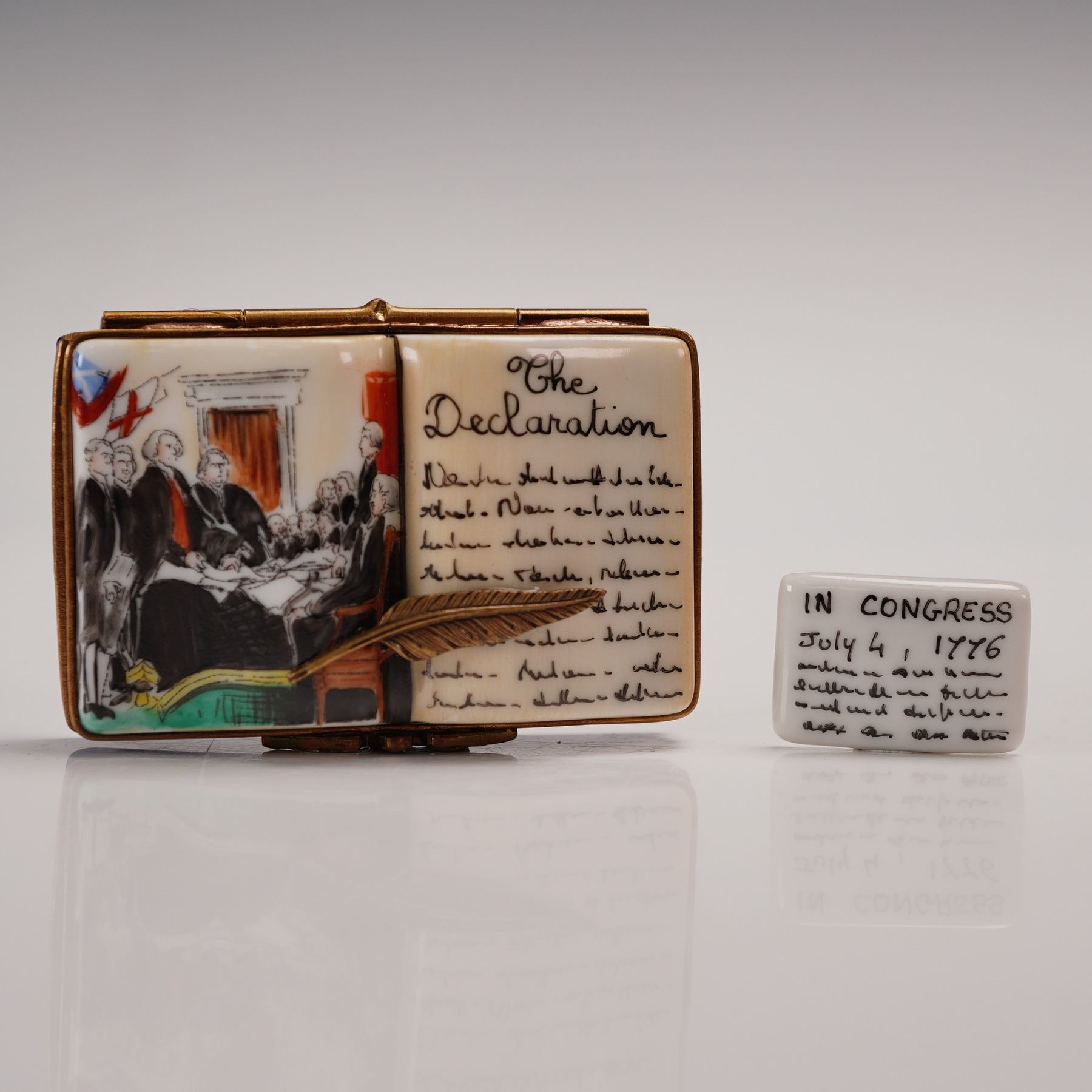 A limited edition hand-painted Limoges porcelain trinket box, modeled as Botticelli's "Birth of Venus," the standing figure with flowing hair emerging from a scallop shell atop a green base with ornate gilt clasp. The interior decorated with a star design. Reverse with portrait of the Marquise de Pompadour and marked Peint Main Limoges France MP. Complete with original fitted box and certificate.