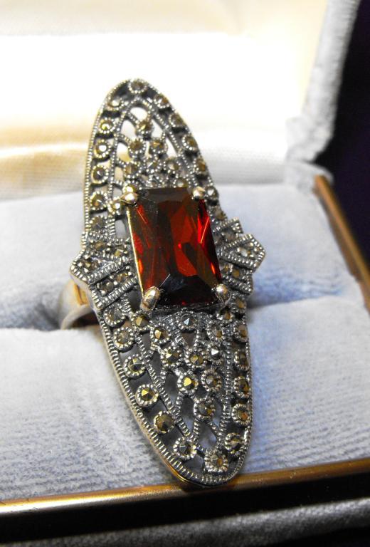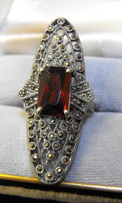 A fancy Edwardian style estate ring set in sterling silver w/ marquisite and garnet.