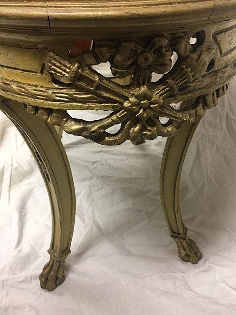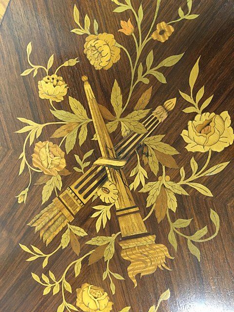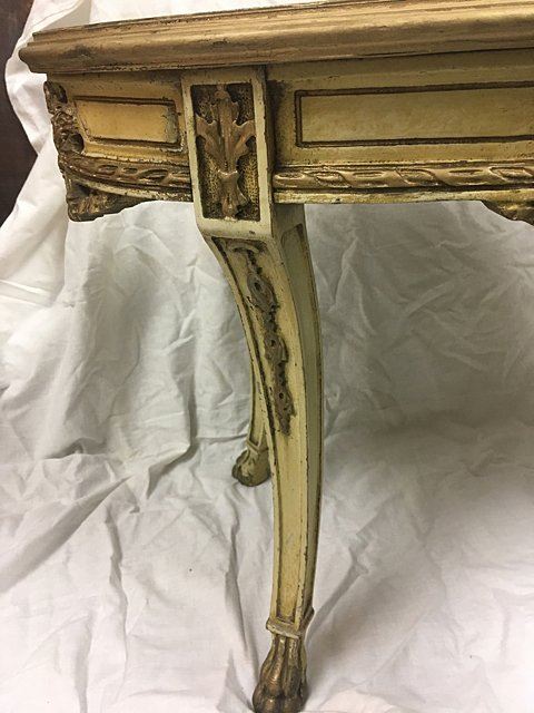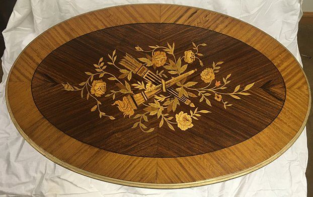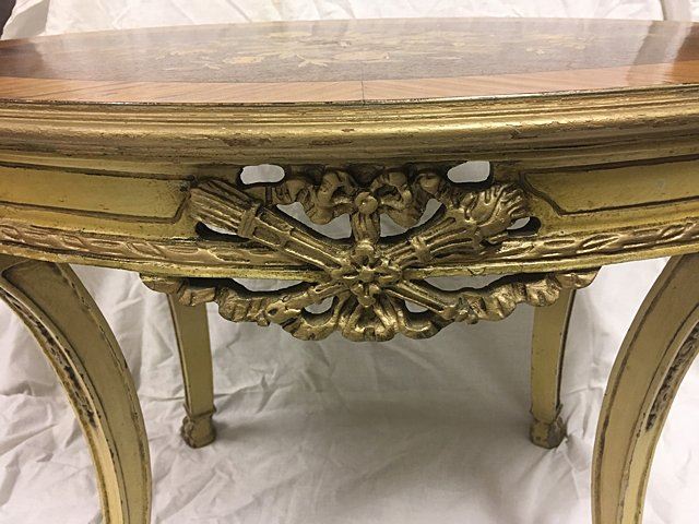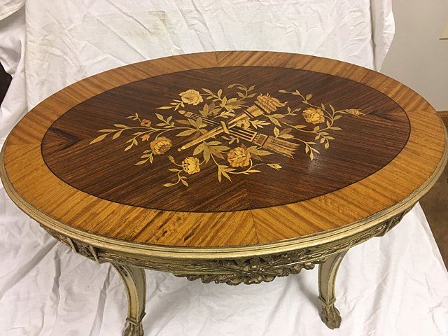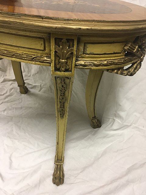 Fabulous marquitry inlay top with classical musical instruments. Base has carved panels all the way around, on beautiful claw feet, paint decorated base, very unusual style, coffee table size. Measures approx. 28" long x 18" wide x 20" tall.