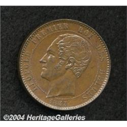 <B>Marriage 10 Centimes 1853,</B></I> KM5, Choice brown UNC. <BR><BR><B>Important notice:</B> Heritage usually auctions material at the rate of 200-250 lots per hour. On some occasions eBay Live bid software or the Internet may not be able to keep up with the pace of the auction. We recommend placing a realistic absentee bid now as insurance to avoid disappointment. Occasionally the auctioneer may eliminate or reject an eBay Live bid, and the auctioneer may also reopen a lot after the close of the eBay live bidding (usually because we missed an audience bid), and may reject your bid even if it shows you as the winning bidder. By bidding via eBay Live, you agree that Heritage may award the lot to another bidder at its sole discretion under the circumstances described above or any other reasonable circumstances. Since eBay bids are not shown to us until we open the lot on the floor, we treat those bids just like floor bids. In most cases the floor responds before the eBay bid is presented to us, due to Internet lag time, so for consistency we have made it a policy that floor bids are always considered first over tie eBay live bids. Also please note that all Heritage lots purchased through eBay Live carry a 20% Buyer's Premium. Please make sure you read the Terms and Conditions before you bid.