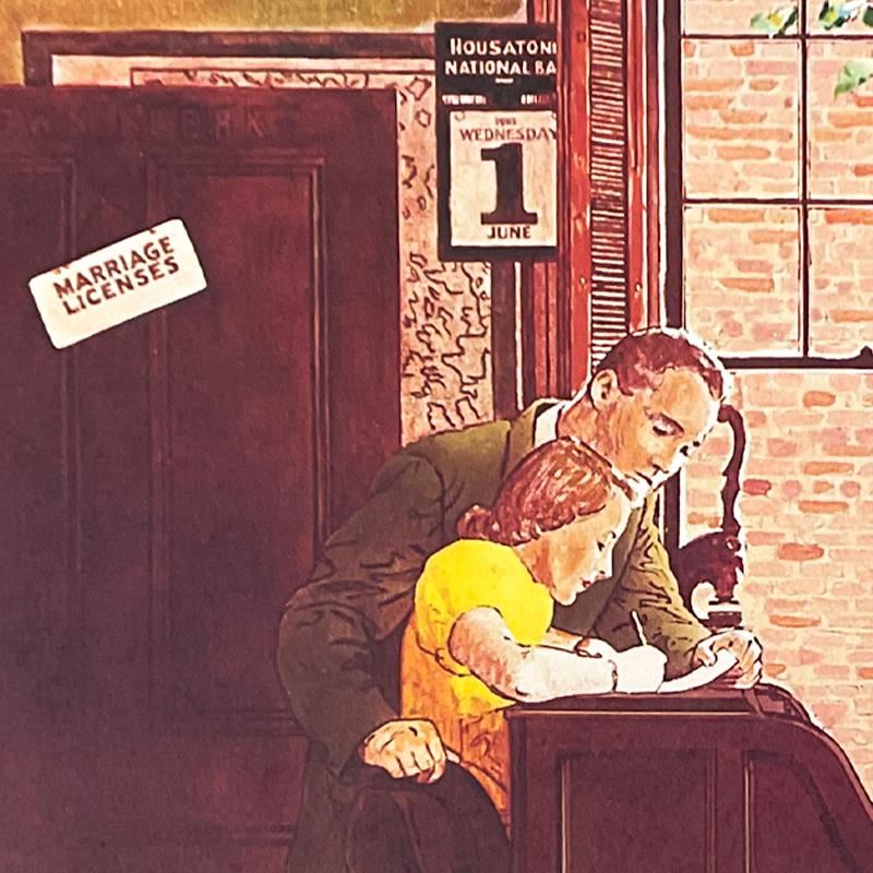 "Marriage License" is a limited edition offset lithograph on paper by Norman Rockwell (1894-1978) numbered inverso. Includes Letter of Authenticity. Measures approx. 21" x 23" (image). ** Please note: There may be minor imperfections on the paper; particularly on the corners and edges but these imperfections will be concealed when the piece is framed. **