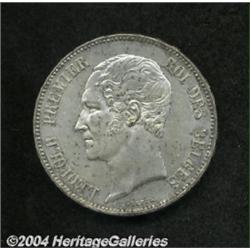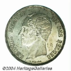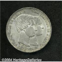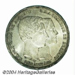 Marriage of the Duke and Duchess of Brabant Medallic 5 francs 1853, Bust of Leopold left/Conjoined busts right, Dup-540, Dav-52, KM-M8.2, lightly toned Uncirculated.From the Marshall Frumer Collection. Important notice: Heritage usually auctions material at the rate of 200-250 lots per hour. On some occasions eBay Live bid software or the Internet may not be able to keep up with the pace of the auction. We recommend placing a realistic absentee bid now as insurance to avoid disappointment. Occasionally the auctioneer may eliminate or reject an eBay Live bid, and the auctioneer may also reopen a lot after the close of the eBay live bidding (usually because we missed an audience bid), and may reject your bid even if it shows you as the winning bidder. By bidding via eBay Live, you agree that Heritage may award the lot to another bidder at its sole discretion under the circumstances described above or any other reasonable circumstances. Also please note that all Heritage lots purchased through eBay Live carry a 20% Buyer's Premium. Please make sure you read the Terms and Conditions before you bid.