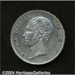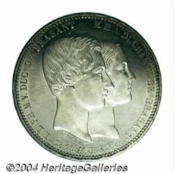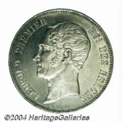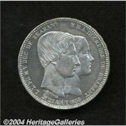 Marriage of the Duke and Duchess of Brabant Medallic 5 francs 1853, Bust of Leopold left/Conjoined busts right, Dup-540, Dav-52, KM-M8.2, prooflike Brilliant Uncirculated with light hairlines.From the I. Kaufman Arenberg Collection. Important notice: Heritage usually auctions material at the rate of 200-250 lots per hour. On some occasions eBay Live bid software or the Internet may not be able to keep up with the pace of the auction. We recommend placing a realistic absentee bid now as insurance to avoid disappointment. Occasionally the auctioneer may eliminate or reject an eBay Live bid, and the auctioneer may also reopen a lot after the close of the eBay live bidding (usually because we missed an audience bid), and may reject your bid even if it shows you as the winning bidder. By bidding via eBay Live, you agree that Heritage may award the lot to another bidder at its sole discretion under the circumstances described above or any other reasonable circumstances. Also please note that all Heritage lots purchased through eBay Live carry a 20% Buyer's Premium. Please make sure you read the Terms and Conditions before you bid.