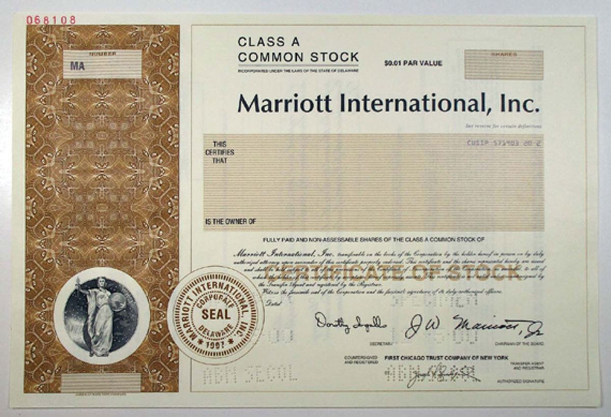Marriott International, Inc, 2000 Odd Shrs Specimen Stock Cert., VF-XF ABN Brown. Marriott International, Inc. is an American multinational diversified hospitality company that manages and franchises a broad portfolio of hotels and related lodging facilities.