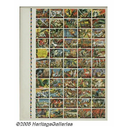 <B>Mars Attacks Trading Cards Color Proof (Topps, 1962)</B></I> Planning to conquer the Earth, Mars sends flying saucers through space carrying deadly weapons. The Martians destroy much of Earth's population, and those that are left go into hiding. Despite its losses, Earth launches a counter-attack that shatters the Martians on their home planet, Mars! Topps' 1962 " "<B>Mars Attacks</B></I> set is one of the collecting hobby's most coveted non-sports series. The set consists of 55 cards in all, 54 are painted images, and one card features a synopsis of the story. We are proud to present this original color proof, which features the color images printed onto a sheet, with the black line art on a separate acetate overlay. The image area measures approximately 17"" x 27"", and the condition is Excellent. A unique bit of " "<B>Mars Attacks</B></I> memorabilia! <BR><BR><B>Important notice:</B> Heritage usually auctions material at the rate of 200-250 lots per hour. On some occasions eBay Live bid software or the Internet may not be able to keep up with the pace of the auction. We recommend placing a realistic absentee bid now as insurance to avoid disappointment. Occasionally the auctioneer may eliminate or reject an eBay Live bid, and the auctioneer may also reopen a lot after the close of the eBay live bidding (usually because we missed an audience bid), and may reject your bid even if it shows you as the winning bidder. By bidding via eBay Live, you agree that Heritage may award the lot to another bidder at its sole discretion under the circumstances described above or any other reasonable circumstances. Since eBay bids are not shown to us until we open the lot on the floor, we treat those bids just like floor bids. In most cases the floor responds before the eBay bid is presented to us, due to Internet lag time, so for consistency we have made it a policy that floor bids are always considered first over tie eBay live bids. Also please note that all Heritage lots pu