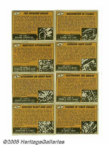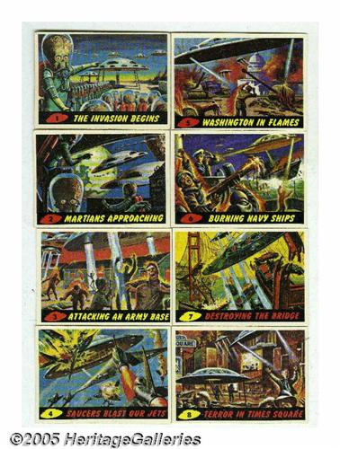 <B>Mars Attacks Trading Cards Complete Set (Topps, 1962) Condition: Average EX/MT.</B></I> Charming in its cartoonish design and horrifying in its depictions of extreme violence, this 1962 set remains one of the collecting hobby's favorite non-sports issues. These cards take us through the Martians' gory attempt to conquer Earth, and culminates with Earth's eventual counter-attack, and the ensuing devastation of the red planet. The drawings for the series were done by EC Comics artists Wally Wood, and Bob Powell, and completed in paint by the prolific Norm Saunders. The <B>Mars Attacks</B></I> set consists of 55 cards in total, with 54 including pictures and the last card featuring a checklist.