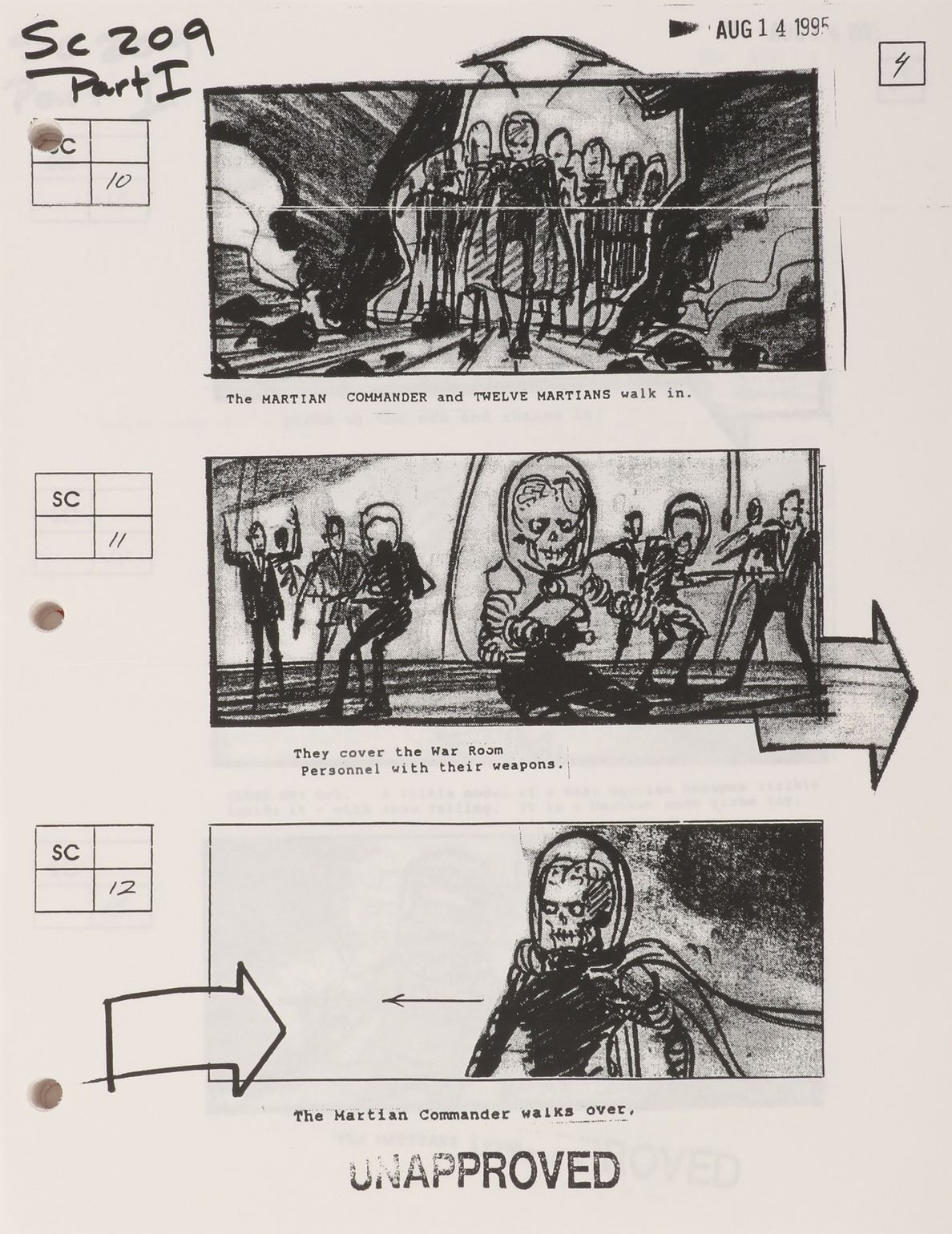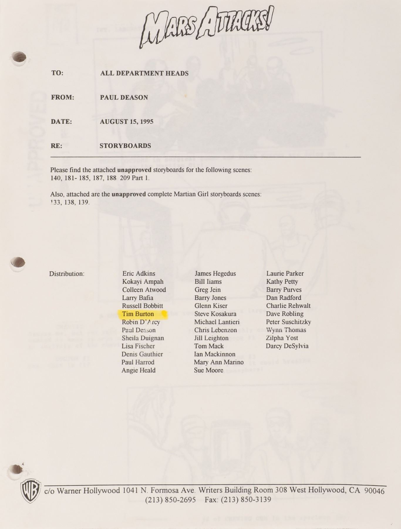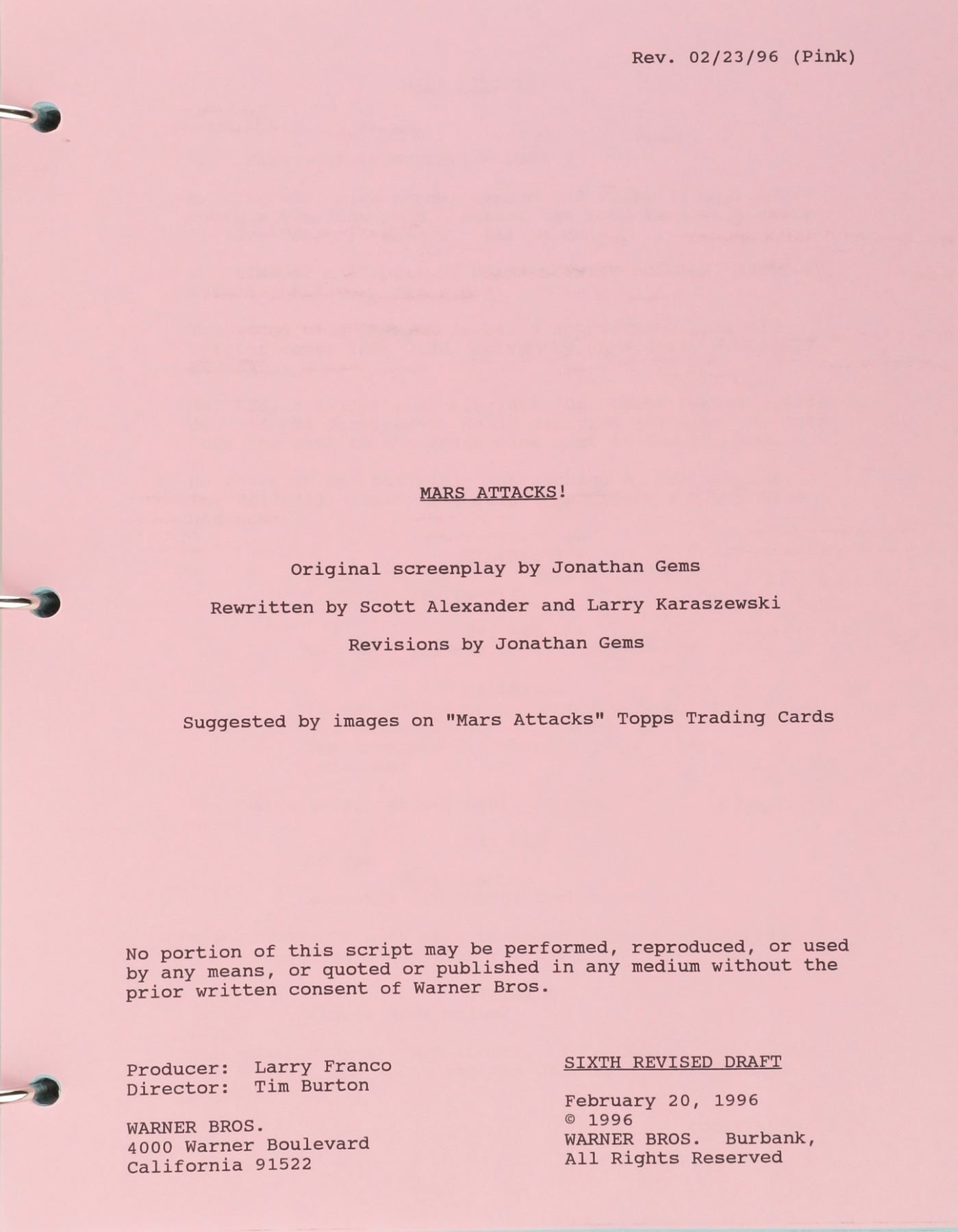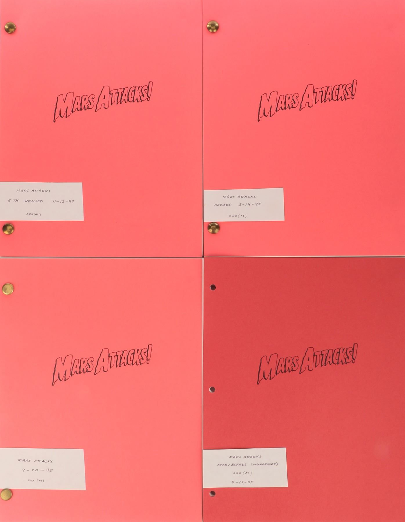 459. Mars Attacks! production bible, including (4) scripts, miscellaneous ephemera and storyboards.(Warner Bros., 1996) Original (1) production notebook containing 200+pages of production requirements, color storyboards, 1-6th revised draft script dated 2-20-96, crew list, 100+pages of special effects lists and storyboards, and beeper list. Also included are (3) studio bound and bradded earlier draft scripts dated 7-20-95, 8-14-95, 11-12-95 and (1) studio bound 74-page set of "unapproved" storyboards dated 8-15-95. Exhibiting minor production wear. In fine condition. $300 - $500