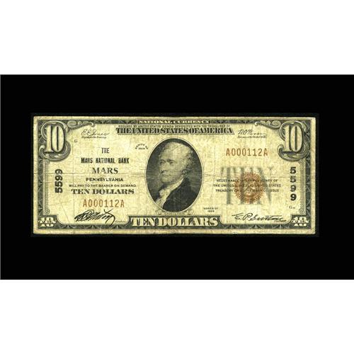 <B>Mars, PA</B></I> - $10 1929 Ty. 1 <B>The Mars NB</B></I> Ch. # 5599<BR>This <B>Very Good</B></I> example displays some soiling from circulation, but no actual damage and was issued by the only bank in town. Scarce enough to be worth about...