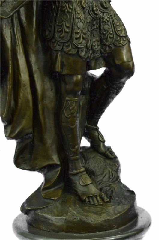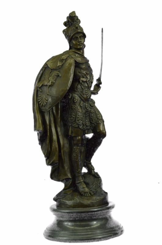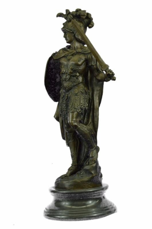 This bronze sculpture of Mars, the most prominent of the military gods, appears larger than life in all his intricately detailed attire. In early Roman times, Mars was known as the God of Spring, fertility, and the protector of the home. Over time, Mars evolved into the god of death and war. The month of March and the planet Mars were also named after this important god. Mars displays a confident stature as he prepares for battle bearing a shield in his left hand. His prominently high cheekbones, fearless large eyes, and thick curly hair are further accentuated by the extremely ornate and traditional Roman helmet with a crest. His body armor portrays two sacred wolves which were often associated with his being. The kilt around his waist and cloak draped behind him, add to the grandeur of this mythological persona. Bring this larger-than-life hero into your castle and let him serve as a reminder of his historically significant contributions to the Roman Empire. Dimensions: Height 29 X Width 13 inches. Weight: 60 LBS.