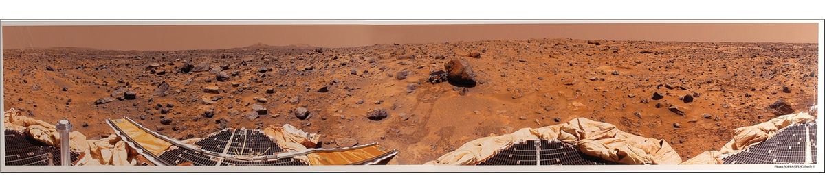 Breathtaking crystal clear unsigned color satin-finish 50.5 x 9.25 panoramic photo of one of the Mars rovers investigating a boulder, taken from the lander. Rolled and in fine condition.