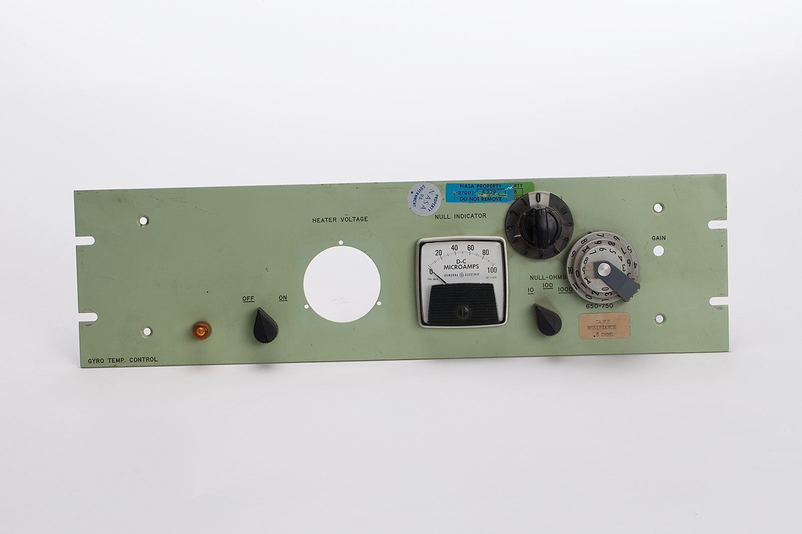 JPL Mars Viking Ground Support Equipment Panel, measuring 19? x 5? x 4.5?, with NASA property labels on the front, a DC microamps voltage meter, and series of knobs and switches. The lower left corner of the faceplate is marked, "Gyro Temp. Control." In fine condition.