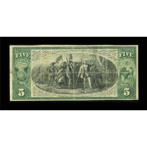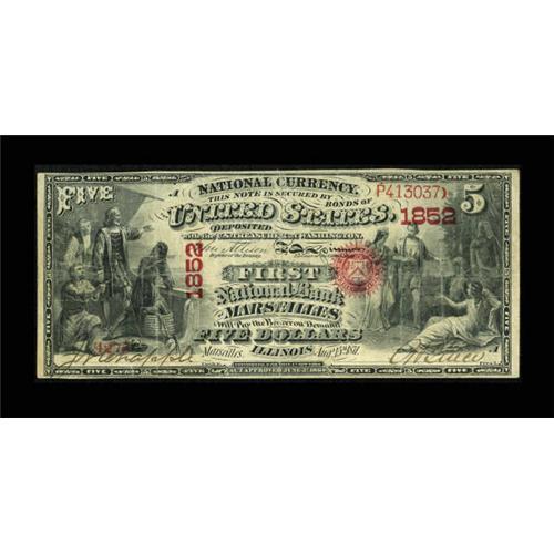 <B>Marseilles, IL</B></I> - $5 Original Fr. 399 <B>The First NB</B></I> Ch. # 1852<BR> The bold color, decent paper quality, and remaining signatures make this an eye appealing original $5. Only large size notes were issued by this bank and today less than a dozen are known to exist in the collecting fraternity. A couple of minor edge splits are noted for accuracy. <B>Fine-Very Fine</B></I>. <BR><BR><b>Shipping:</b> Coins & Currency (<a target="_blank" href="http://www.heritageauctions.com/common/shipping.php">view shipping information</a>)