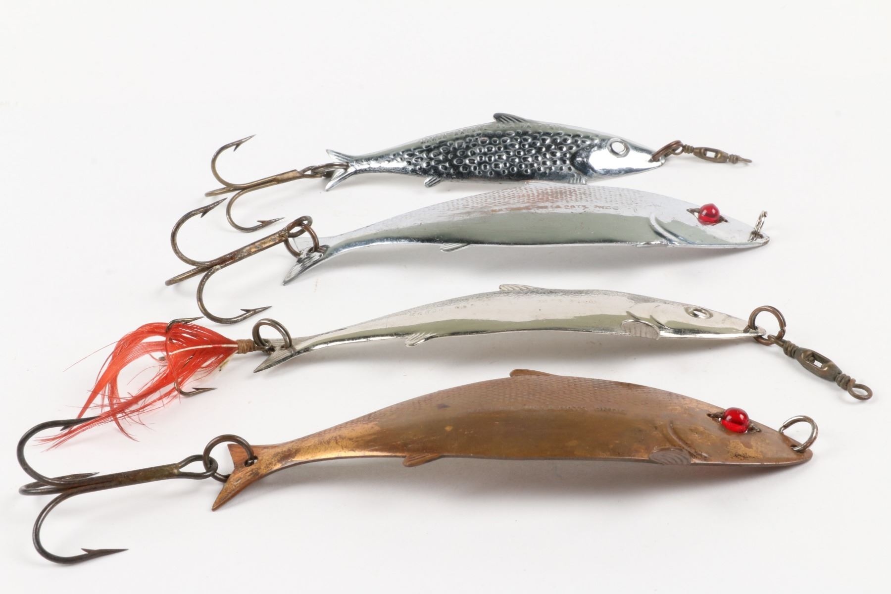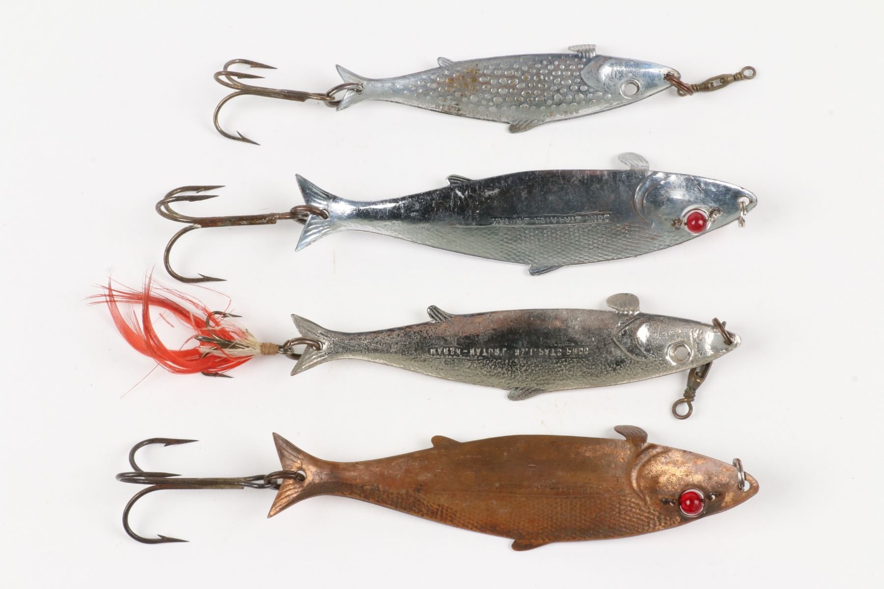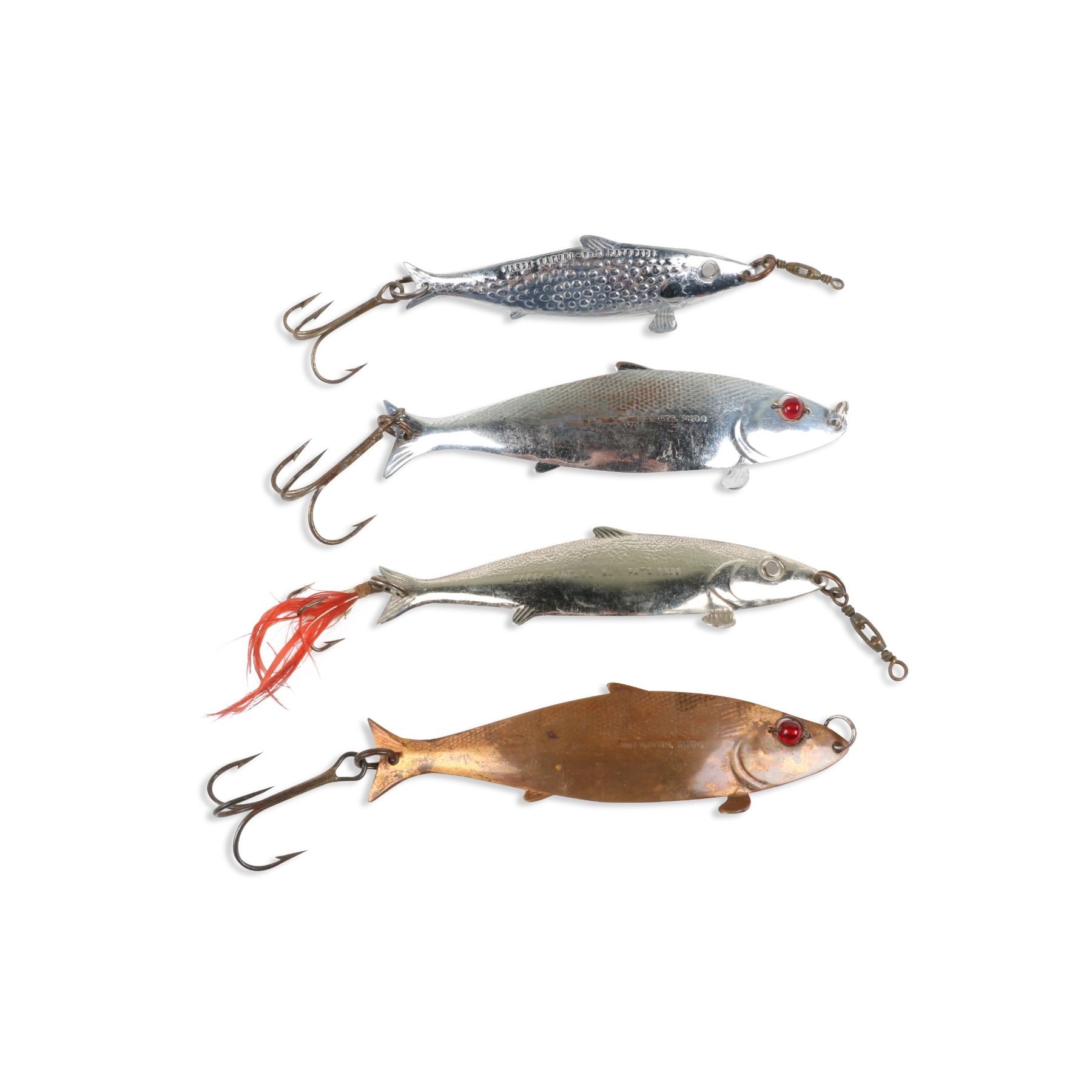 Lif-Lik Natural Bait Co., Canada. Material: Metal. Quantity: 4. Grade: VG. 4.25" - 5.5" Est. $100-125.
