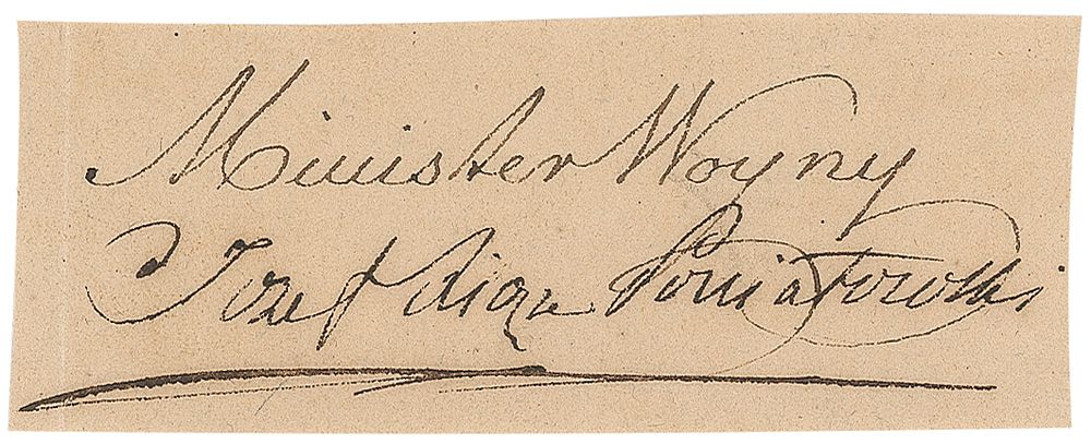 Polish leader, general, minister of war and army chief (1763–1813), who became a Marshal of the Empire. Ink signature on an off-white 3.25 x 1.25 slip, clipped from a larger document. In fine condition.