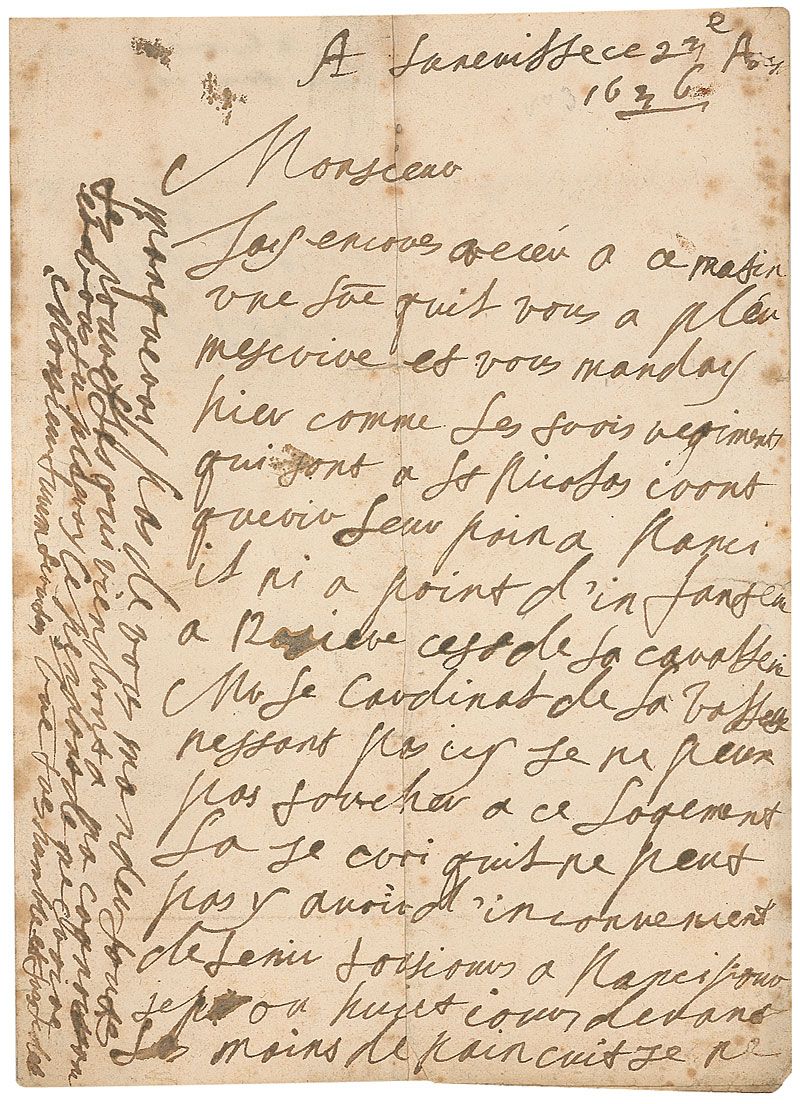 Henri de la Tour d'Auvergne, Vicomte de Turenne (1611–1675) was the most famous French military leader during the early reign of Louis XIV, who became Marshal General of France. Uncommon ALS signed vertically in the left border, one page, 6 x 8.25, April 27, 1636. Untranslated letter to the bishop of Mandé on military matters, mentioning Cardinal de la Valette. Autograph address panel maintains his original seals and silk ribbons. In very good condition, with intersecting folds and scattered foxing and soiling.