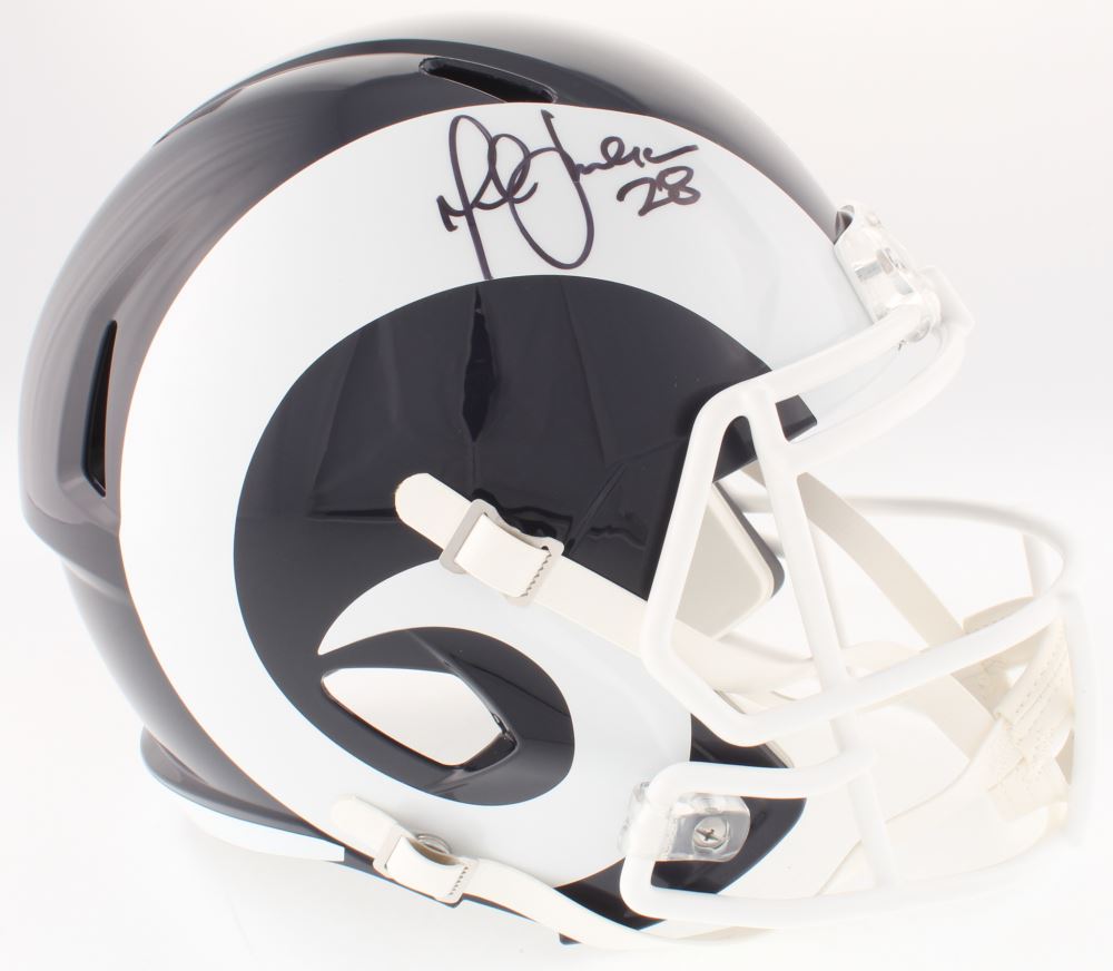 Rams full-size replica speed helmet has been hand-signed in black felt-tip pen by Marshall Faulk (HOF).Â